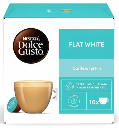 Descopera NESCAFÉ Dolce Gusto Flat White, un sortiment creat in cafenelele elegante din Australia si Noua Zeelanda. Aceasta cafea isi castiga reputatia datorita laptelui fin, adaugat cu deosebita pricepere si atentie peste un espresso indraznet. Se remarca prin textura dulce, unicitate si spuma marmorata, de culoarea nucilor. Savureaza-l acum in confortul propriei locuinte si lasa-te captivat de notele dulci si delicioase de caramel. Flat White - inspirat de o cafea emblematica din Australia, definita de profilul catifelat., Descopera NESCAFÉ Dolce Gusto Flat White, un sortiment creat in cafenelele elegante din Australia si Noua Zeelanda. Aceasta cafea isi castiga reputatia datorita laptelui fin, adaugat cu deosebita pricepere si atentie peste un espresso indraznet. Se remarca prin textura dulce, unicitate si spuma marmorata, de culoarea nucilor. Savureaza-l acum in confortul propriei locuinte si lasa-te captivat de notele dulci si delicioase de caramel. Flat White - inspirat de o cafea emblematica din Australia, definita de profilul catifelat.