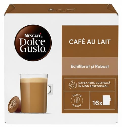 O idee delicios de simpla si un nume sofisticat, frantuzesc: NESCAFÉ Dolce Gusto Café au Lait. Acest amestec indraznet de cafea si lapte intr-o singura capsula iti aduce gustul binecunoscut al cafelei cu lapte pe care o poti savura la micul dejun sau la orice ora din zi. Multumita presiunii profesionale de pana la 15 bari a aparatelor noastre stilate, vei obţine o cafea excelenta, exact ca intr-o cafenea, cu un gust absolut savuros. Este foarte simplu sa folosesti capsulele de cafea NESCAFÉ Dolce Gusto Café au Lait, astfel incat doar la cateva momente distanta de la apasarea unui buton te poţi bucura de o cafea cu un gust intens si rafinat, cu un strat fin de spuma cremoasa. Si daca iti doresti un plus de rasfat, poti incerca si alte varietati de cafea NESCAFÉ Dolce Gusto, precum Cappuccino sau Latte Macchiato. Bucura-te de un sortiment inegalabil ce iti aduce gustul preferat al cafelei cu lapte., O idee delicios de simpla si un nume sofisticat, frantuzesc: NESCAFÉ Dolce Gusto Café au Lait. Acest amestec indraznet de cafea si lapte intr-o singura capsula iti aduce gustul binecunoscut al cafelei cu lapte pe care o poti savura la orice ora din zi.
