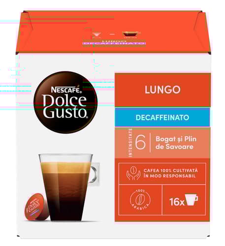 When you just want to enjoy the delicate taste and feel the aromatic bouquet of a balanced coffee, without caffeine, the right choice is Nescafe Dolce Gusto Lungo Decaffeinato coffee. With the same aroma and the same pleasant taste of refined coffee as Lungo, Nescafe Dolce Gusto Lungo Decaffeinato delights your senses during the day or in the evening, no matter how late. Nescafe Dolce Gusto Lungo Decaffeinato is a little treat at any time of the day, whether you want to relax alone or with friends.