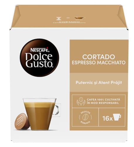 Rich and creamy, an absolutely delicious coffee specialty with roots in Spain, Nescafe Dolce Gusto Cortado is an espresso macchiato that contains a distinct, rich and intense blend of classic espresso and milk that adds extra flavor, being perfect at any time of the day and absolutely necessary in any collection of coffee specialties. With a strong aroma, Nescafe Dolce Gusto Cortado Espresso Macchiato is a coffee covered in a silky cream, specific to any espresso, which brings an extraordinary taste from the first sip.