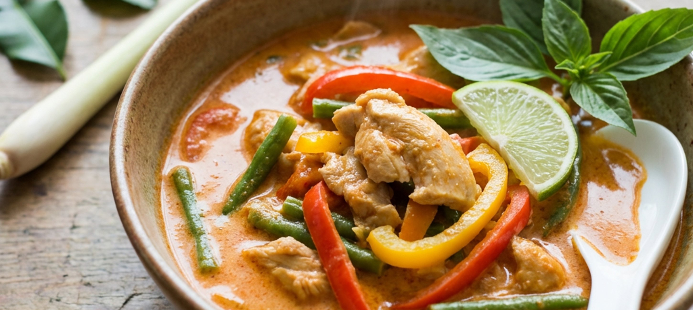 - 2Adăugați pasta de curry roșu peste carnea prăjită. Amestecați bine pentru a elibera aromele, având grijă să nu ardeți pasta. Turnați supa de legume și laptele de cocos.