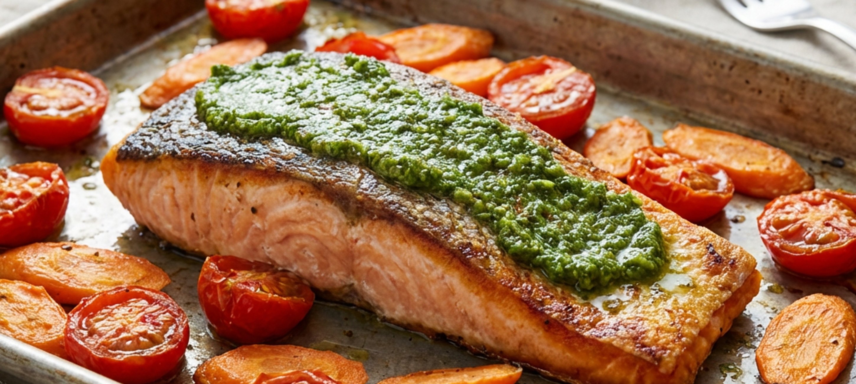 - 5Între timp, pregătiți somonul. Așezați fileurile cu pielea în jos, condimentați-le cu sare și piper, iar deasupra ungeți-le cu o linguriță de pesto de busuioc.
