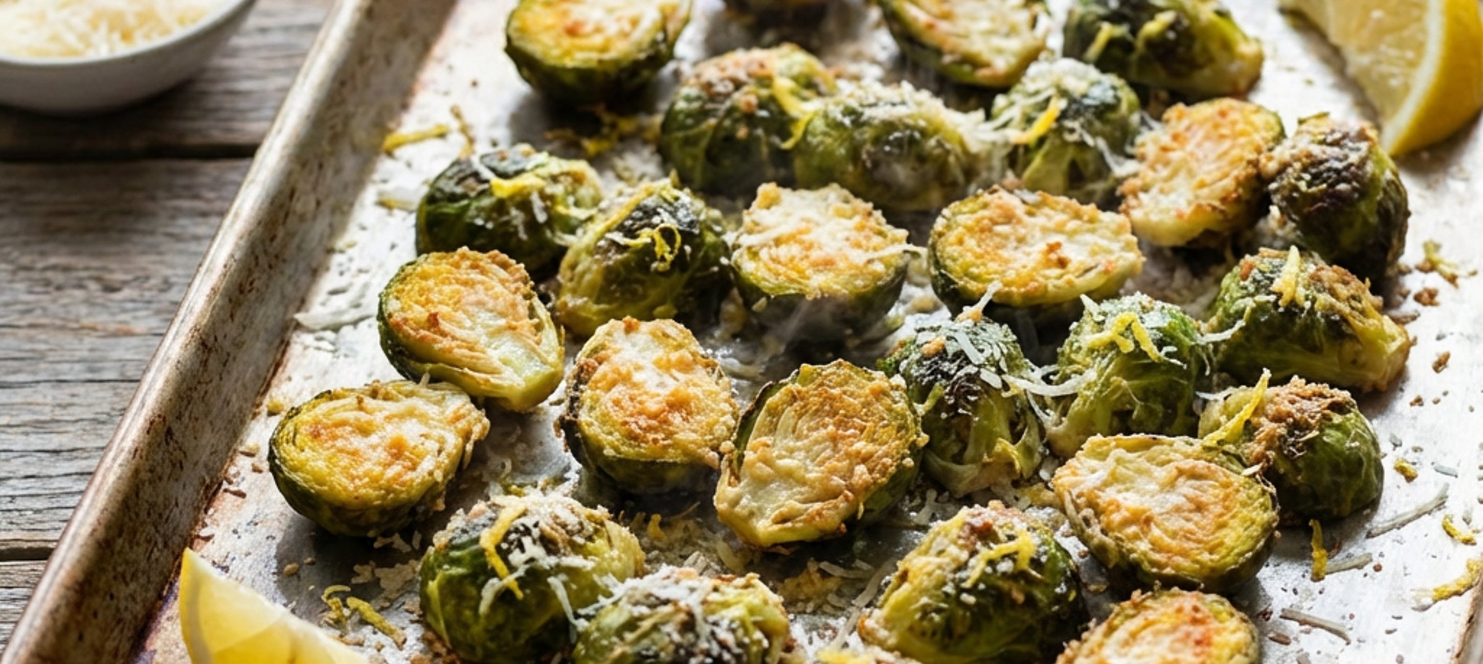 - 3Coaceți în cuptorul preîncălzit până când varza de Bruxelles devine fragedă, iar stratul de brânză este auriu și crocant, aproximativ 16-18 minute. Lăsați să se odihnească timp de 5 minute, apoi desprindeți ușor verzele pentru a le servi. Presărați coajă de lămâie și serviți fierbinte.