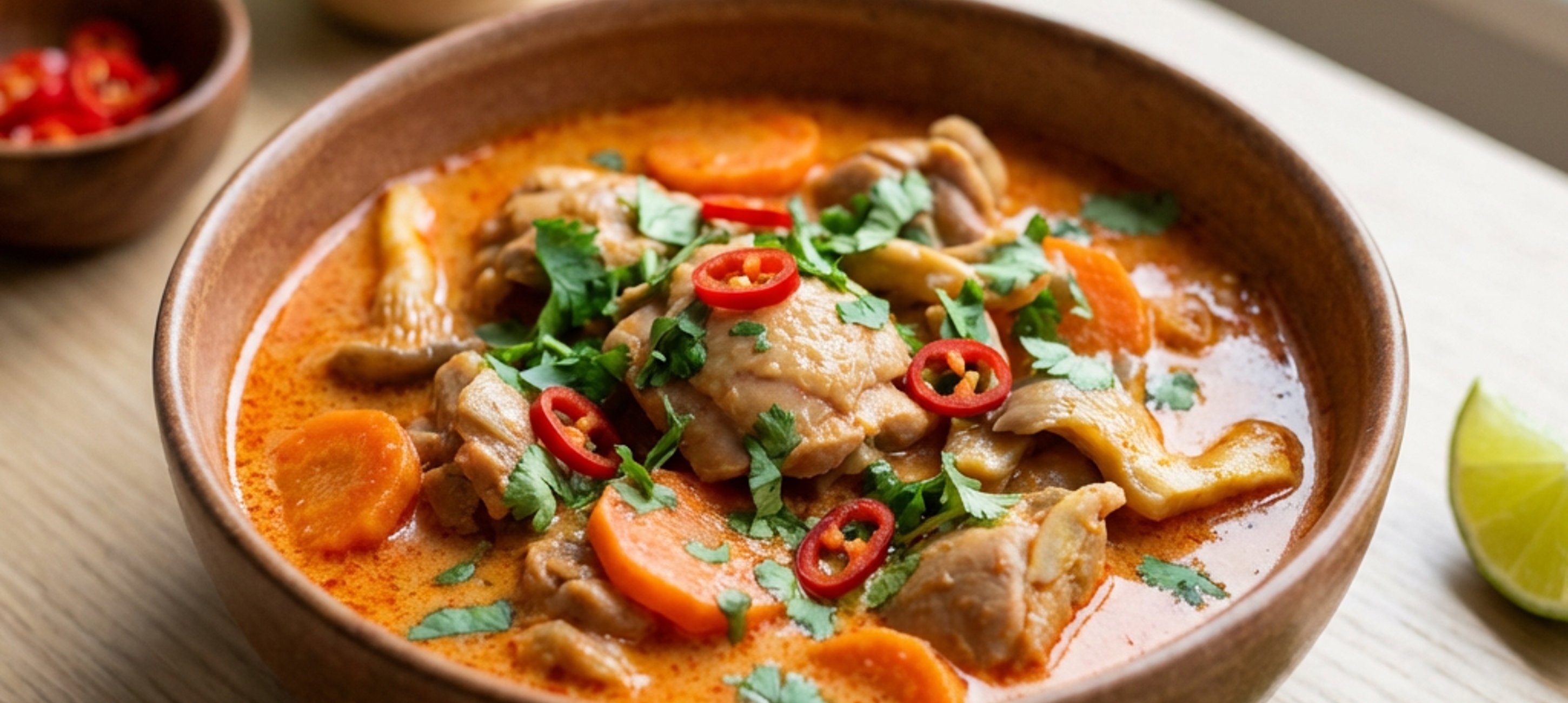 - 5Adăugați laptele de cocos, aduceți la punctul de fierbere, amestecați și lăsați să fiarbă la foc mic timp de 4 minute. Luați de pe foc, încorporați sucul de lime și coriandrul proaspăt. Potriviți de sare după gust.