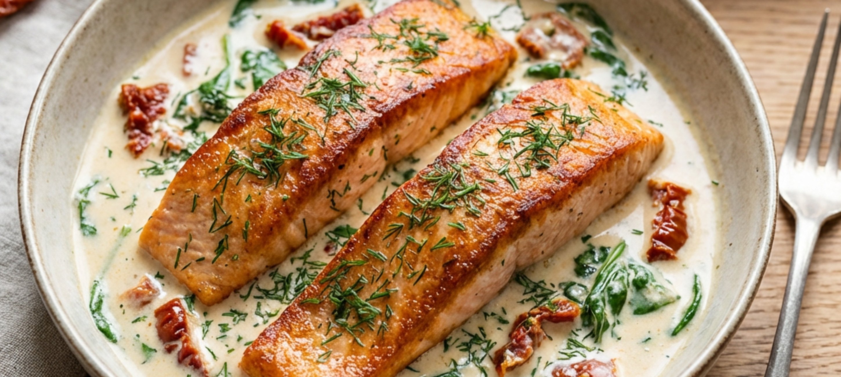 - 3Adaugă în tigaie untul, ceapa tocată, usturoiul tocat și roșiile uscate tocate și sotează-le timp de 1-2 minute la foc mic. Toarnă laptele de cocos, adaugă parmezanul ras și amestecă bine. Pune fileurile de somon prăjite înapoi în tigaie și gătește-le timp de 4-5 minute la foc mic. Între timp, toacă fin pătrunjelul. La final, adaugă baby spanacul și pătrunjelul tocat, amestecă totul și mai gătește încă un minut la foc mic. Oprește focul și servește preparatul imediat. Poftă bună!