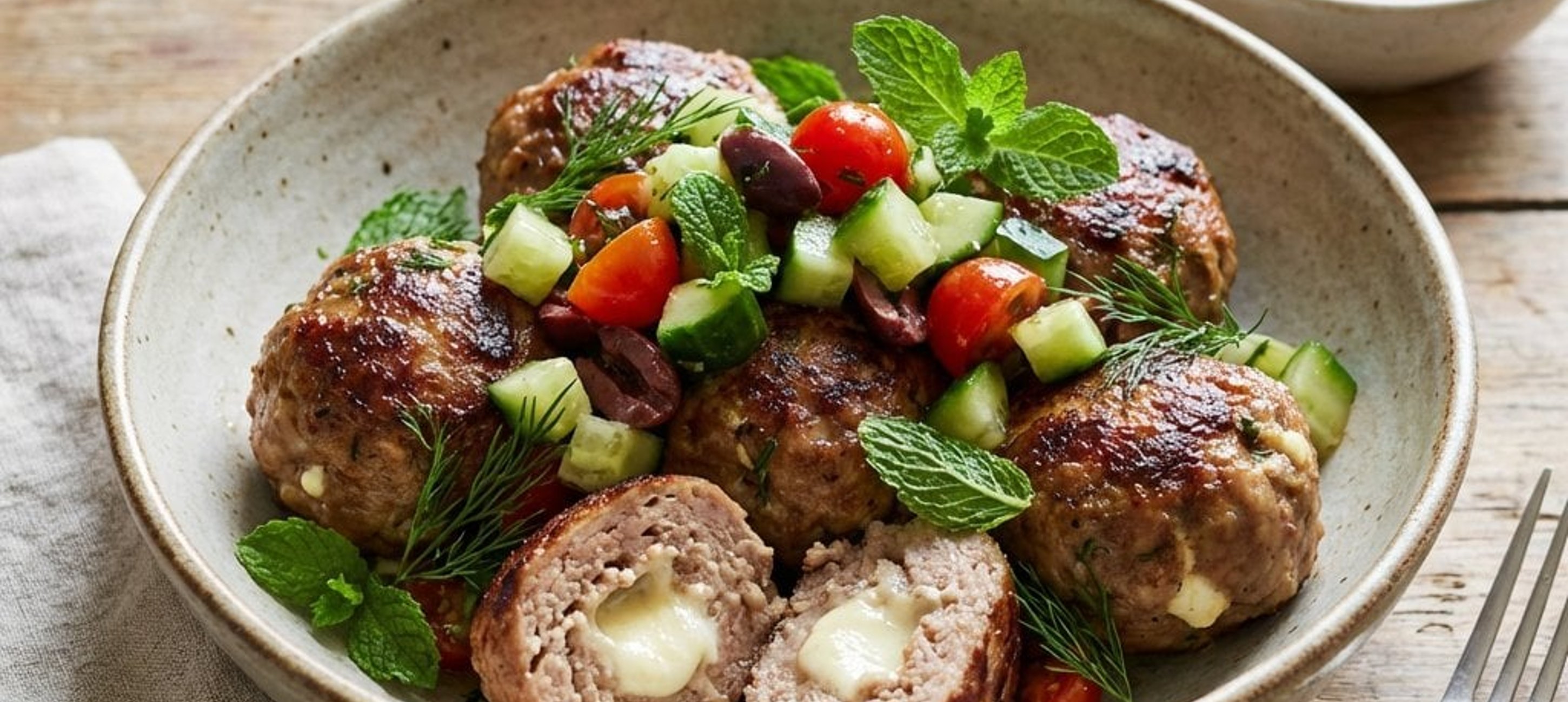 - 4Așezați brânza feta sfărâmată pe 4 dintre chiftele și acoperiți-le cu celelalte 4 chiftele rămase. Apăsați bine marginile pentru a sigila brânza în interior și modelați-le sub formă de chiftele rotunde.