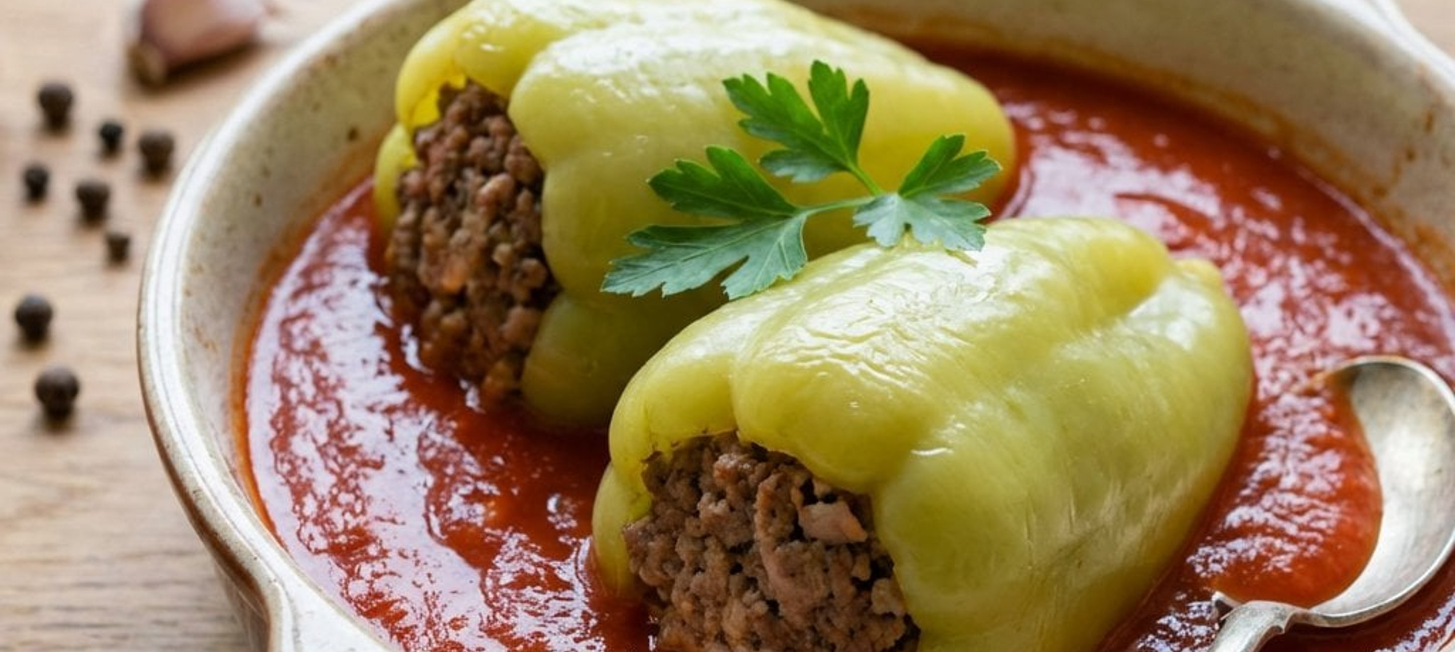 - 1Într-o tavă de copt, distribuiți restul de ceapă și bucățelele de unt. Așezați ardeii umpluți, adăugați apă până la o înălțime de 1 cm și introduceți tava în cuptorul preîncălzit pentru 50–60 de minute, sau până când temperatura interioară a ardeilor ajunge la 85 °C. Scoateți ardeii din tavă și păstrați-i la cald.
