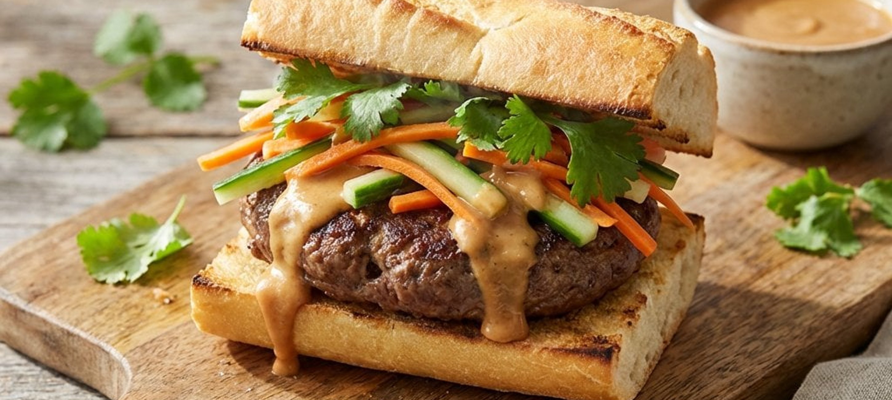 - 2Unge partea inferioară a baghetei cu sosul de arahide, așază carnea, adaugă legumele marinate scurse bine și presară din abundență coriandru proaspăt. Acoperă cu partea superioară a baghetei și servește imediat.