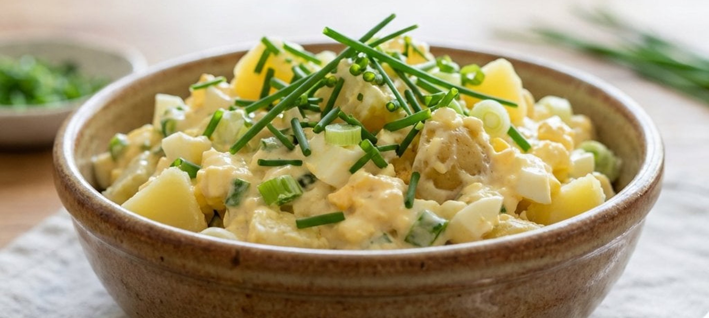 - 3Într-un bol încăpător, amestecați ouăle, cartofii și ceapa verde cu maioneza și muștarul. Condimentați cu sare și piper după gust. Lăsați salata la frigider înainte de servire pentru a se întrepătrunde aromele.