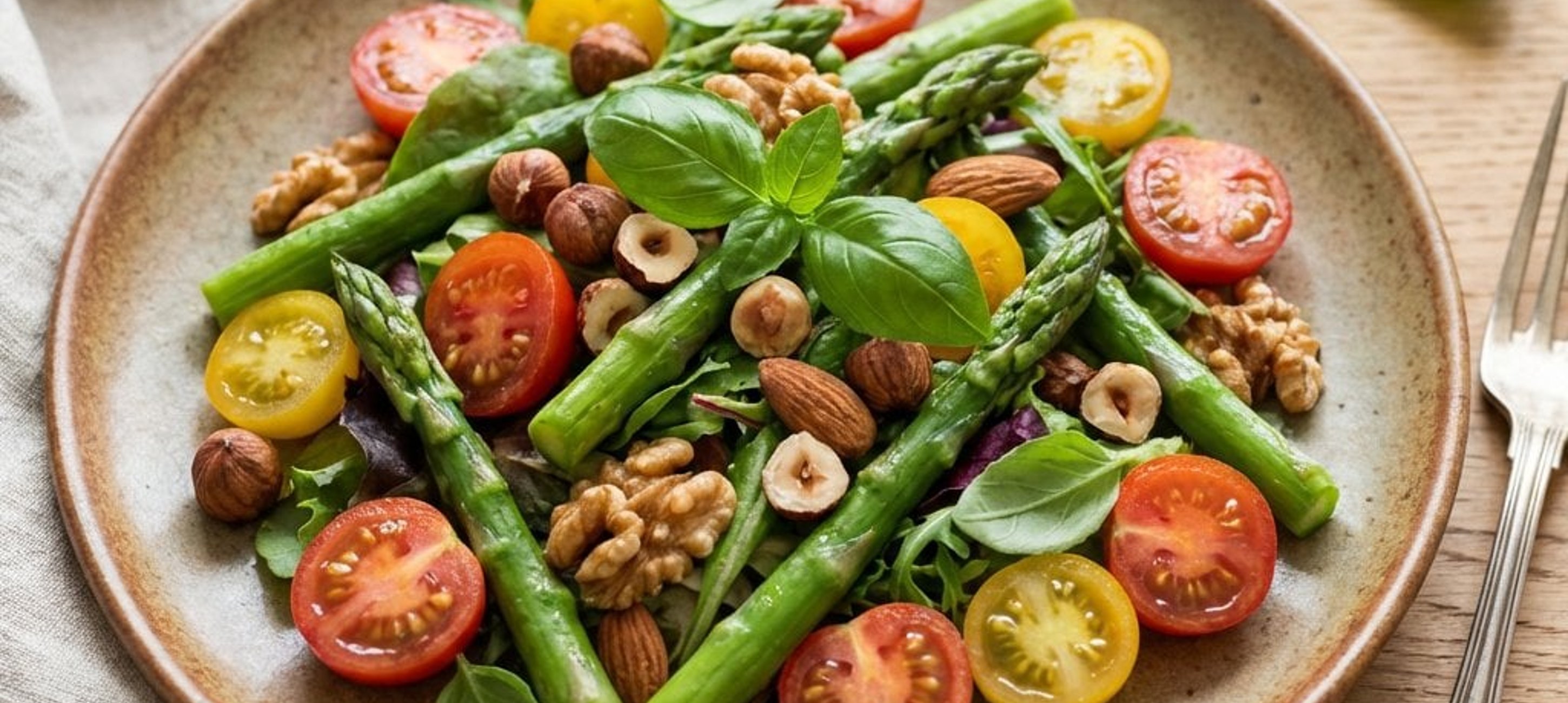 - 1Într-un bol mare, amestecați nucile și migdalele răcite cu stafidele, merișoarele uscate, uleiul de măsline, sucul de lămâie și mierea. Adăugați roșiile tăiate și sparanghelul. Condimentați cu un praf de sare și amestecați bine.