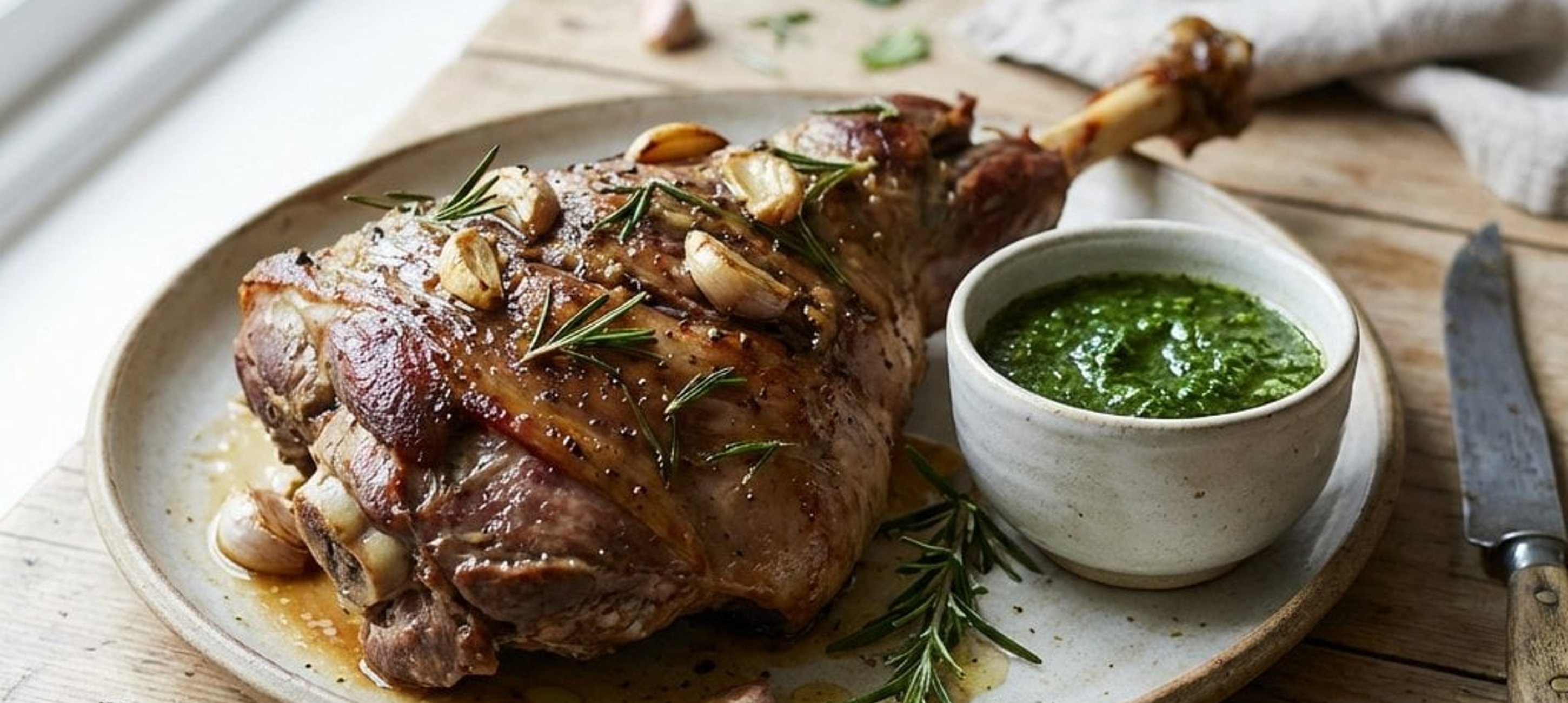 - 5După coacere, mutați carnea pe un grătar încins (opțional, uns cu puțină grăsime) și rumeniți-o pe fiecare parte timp de 5 minute pentru o crustă perfectă. Lăsați carnea să se odihnească timp de 10 minute înainte de servire. Serviți feliile de carne alături de sosul de mentă.