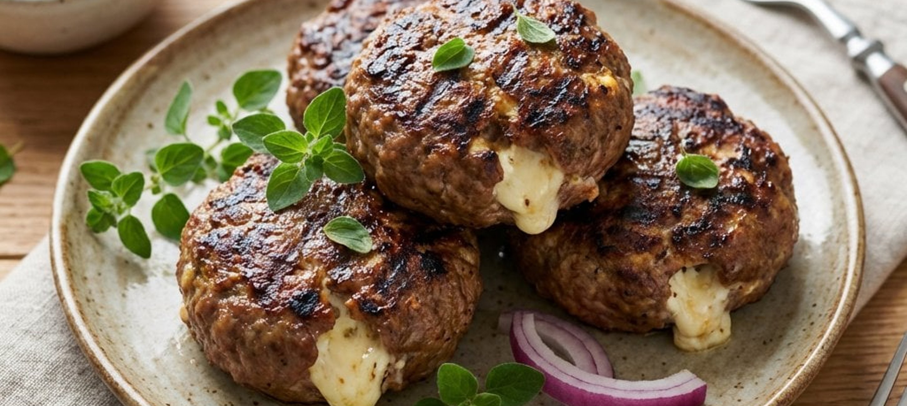 Servește bifteki cu sos tzatziki, roșii cherry și felii subțiri de ceapă roșie.