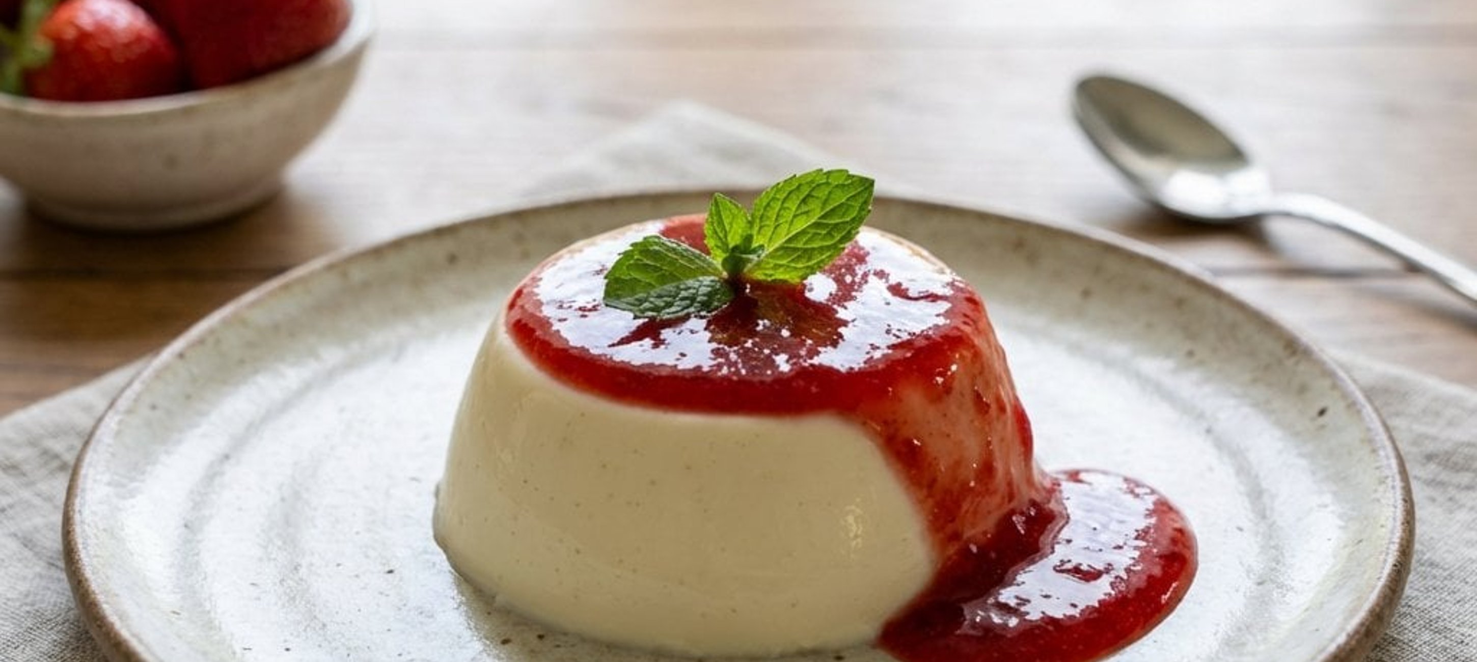 - 3Răsturnați panna cotta pe o farfurie (puteți scufunda formele scurt în apă fierbinte pentru a se desprinde mai ușor). Adăugați sosul de căpșuni deasupra și decorați cu frunze de mentă proaspătă.
