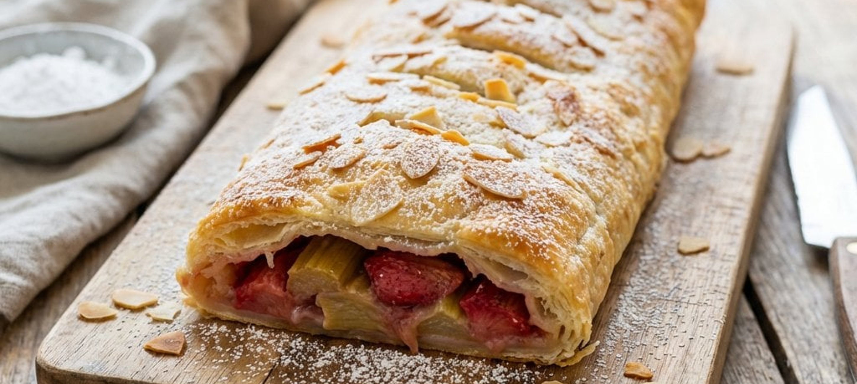 - 3Întindeți aluatul foietaj și împărțiți-l în 3 părți. Pe fiecare parte presărați pișcoturile zdrobite, apoi așezați rubarba și căpșunile. Presărați restul de 150g de zahăr tos, zahărul vanilat, zahărul cu scorțișoară și fulgii de migdale.