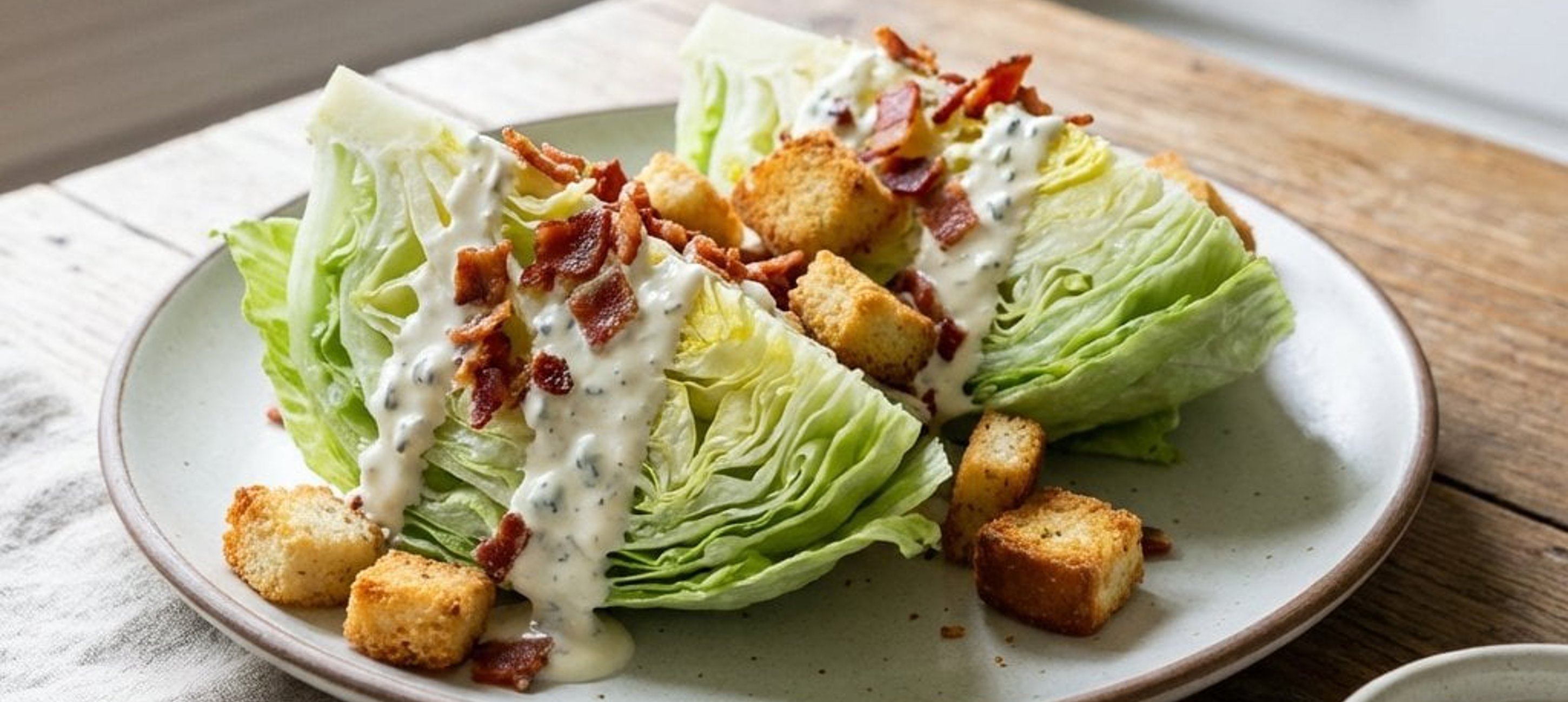 - 4Curățați salata iceberg, îndepărtați cotorul și tăiați-o în opt optimi (felii mari). Așezați câte două felii de salată pe fiecare farfurie, turnați din abundență dressingul de brânză și presărați deasupra crutoanele crocante și cubulețele de bacon.