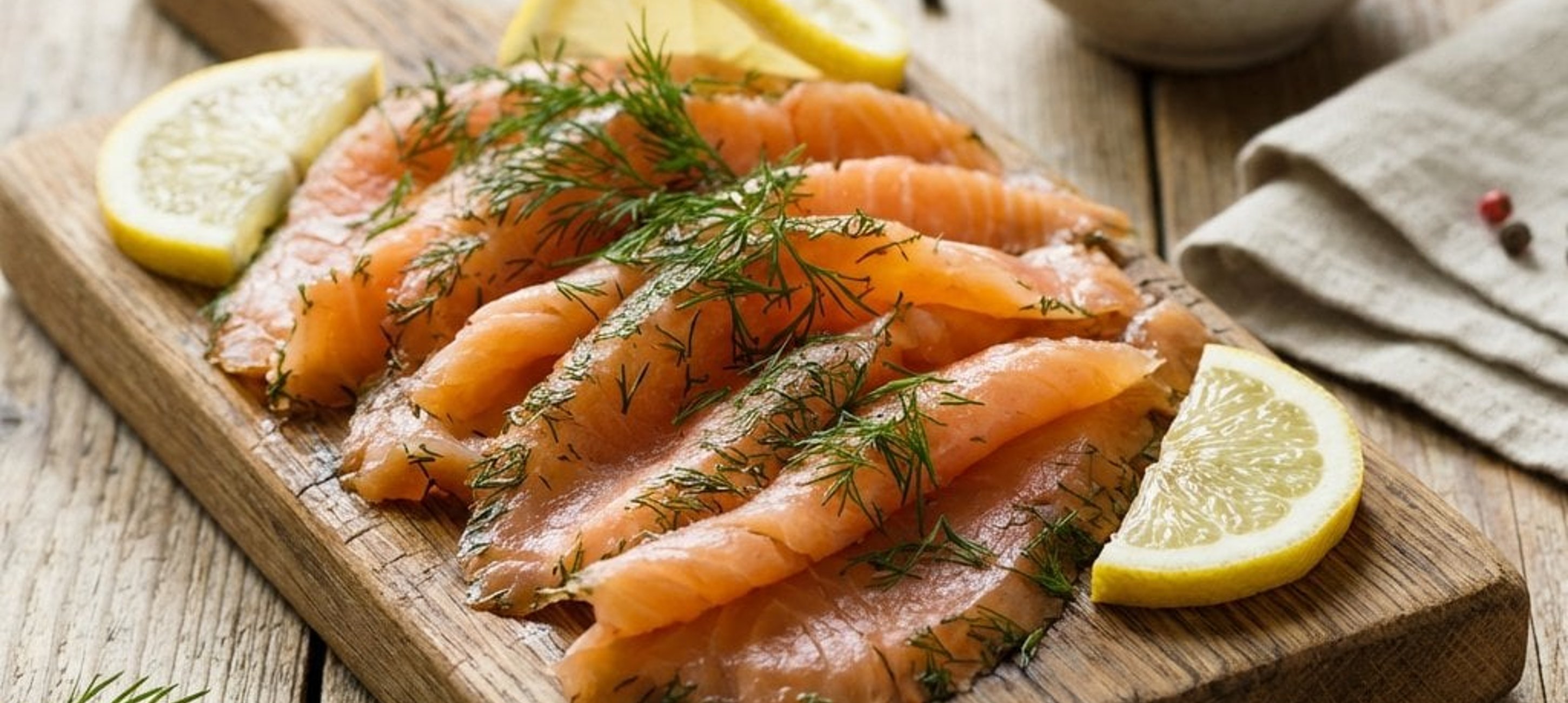 - 1După marinare, scoate somonul și spală-l rapid sub un jet de apă rece, apoi usucă-l bine cu prosoape de hârtie. Folosind un cuțit lung și bine ascuțit, taie felii subțiri de 2–3 mm, tăind pe diagonală.