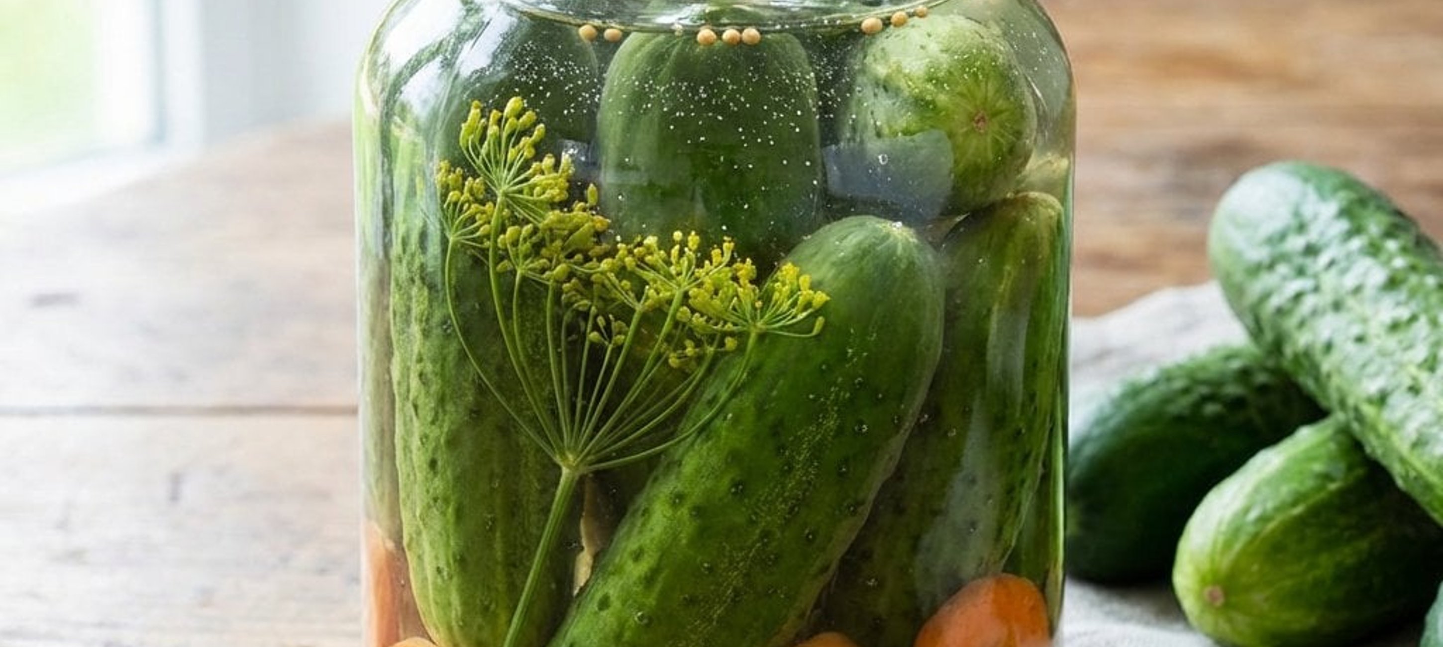 - 2În fiecare borcan curat, așezați la bază: 5 rondele de morcov, 1–2 rondele de hrean, puțină ceapă, 1–2 flori de mărar (în funcție de mărime), ½ linguriță de semințe de muștar, 2 boabe de ienibahar, ½ linguriță de piper negru boabe, 1–2 foi de dafin și 3 cuișoare. Apoi, așezați castraveții în borcane, cât mai strâns posibil.