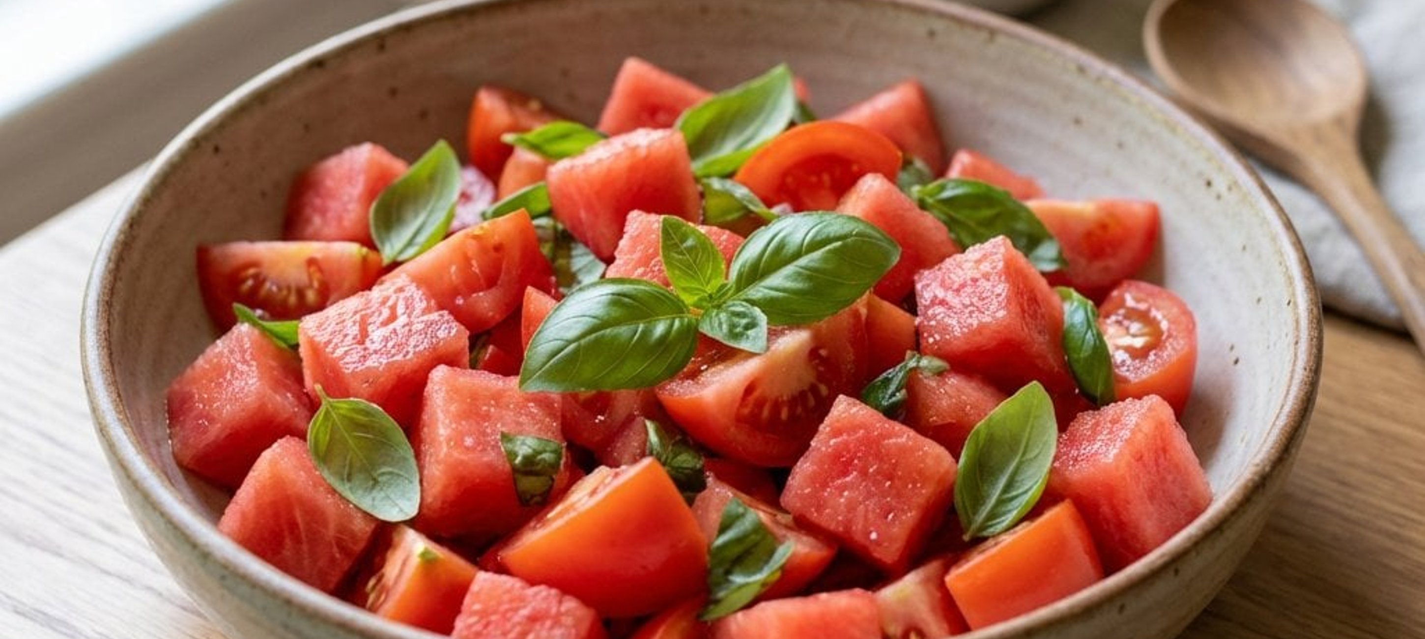 - 3Adăugați cuburile de roșii și pepene în bol, amestecați ușor pentru a le acoperi cu dressing, presărați busuiocul deasupra și serviți imediat.