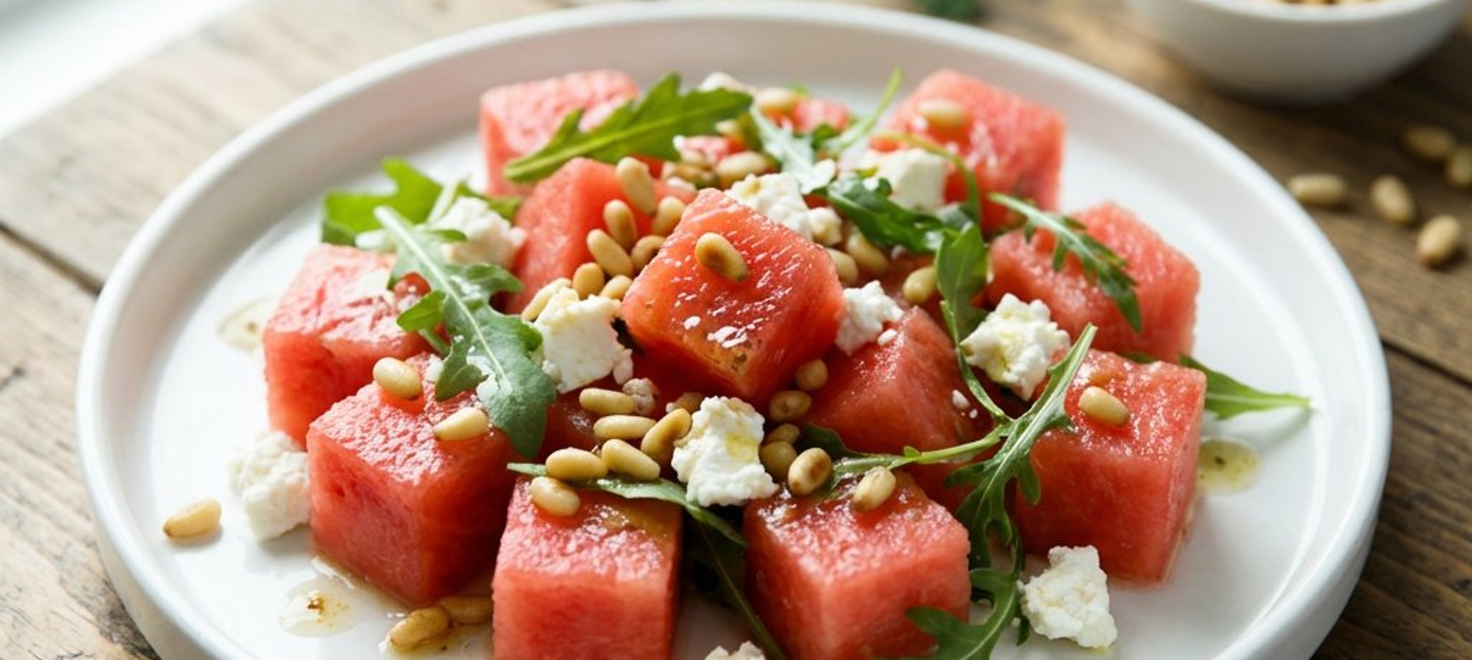 - 2Într-un bol mare de salată, așezați un pat de rucola sau salată verde. Adăugați cuburile de pepene roșu și brânza feta.