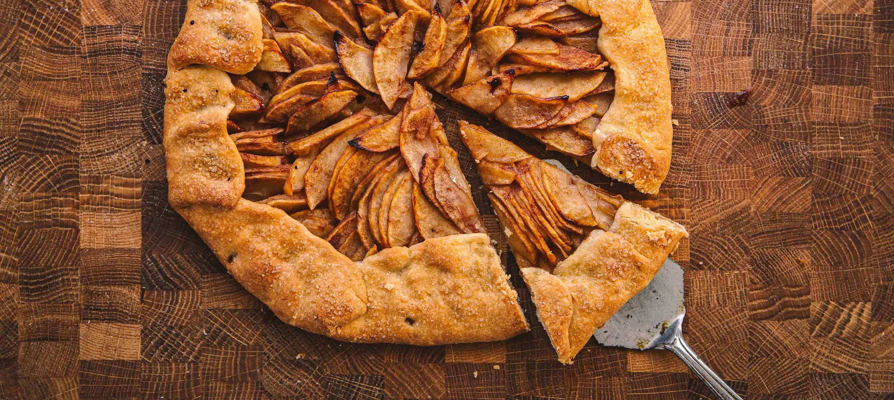 - 2După ce aluatul s-a odihnit, pregătește merele. Curăță-le de coajă, scoate cotoarele și taie-le în felii subțiri. Pune-le într-un bol și amestecă-le cu jumătate din cantitatea de zahăr și scorțișoara. Preîncălzește cuptorul la 180 °C și tapetează o tavă mare cu hârtie de copt. Întinde aluatul direct pe hârtia de copt presărată ușor cu făină, într-un cerc neregulat, de aproximativ 0,5 cm grosime — nu te îngrijora de marginile neuniforme — și transferă-l în tavă.