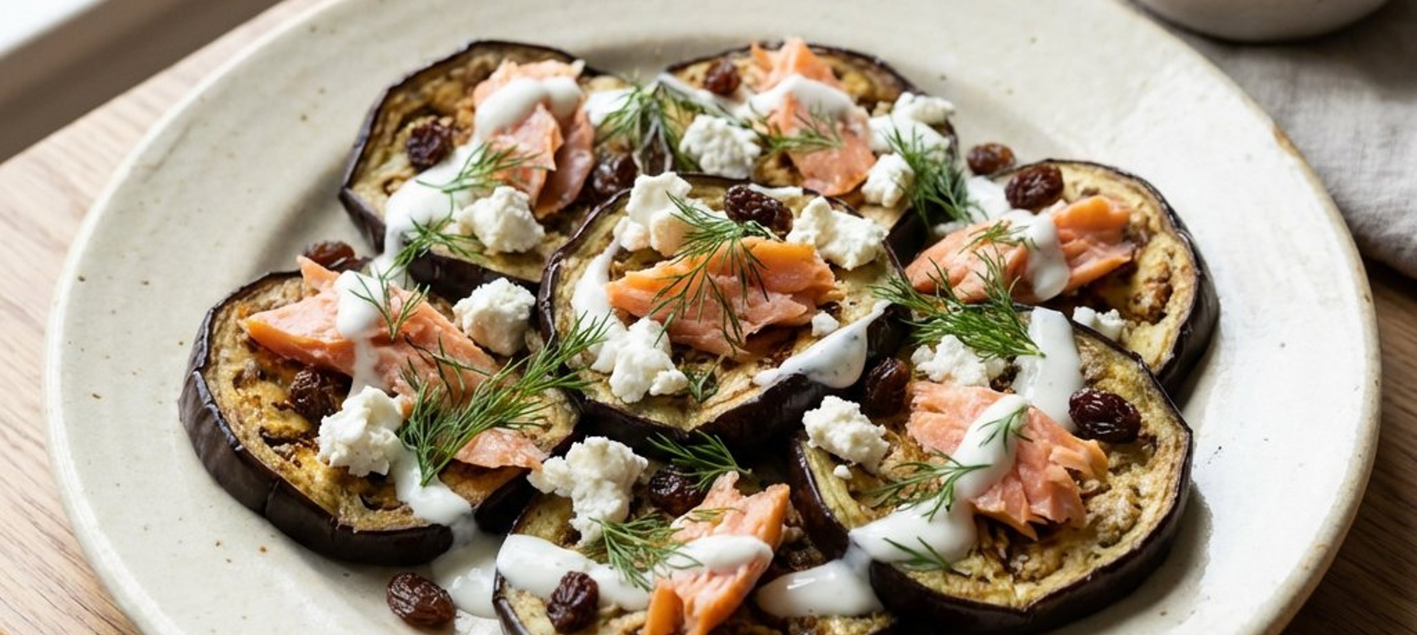 - 6Așezați vinetele scurse pe o farfurie, iar deasupra puneți brânza de capră și somonul afumat. Turnați sosul de iaurt și uleiul din marinarea vinetelor. Decorați cu stafide și mărarul rămas.