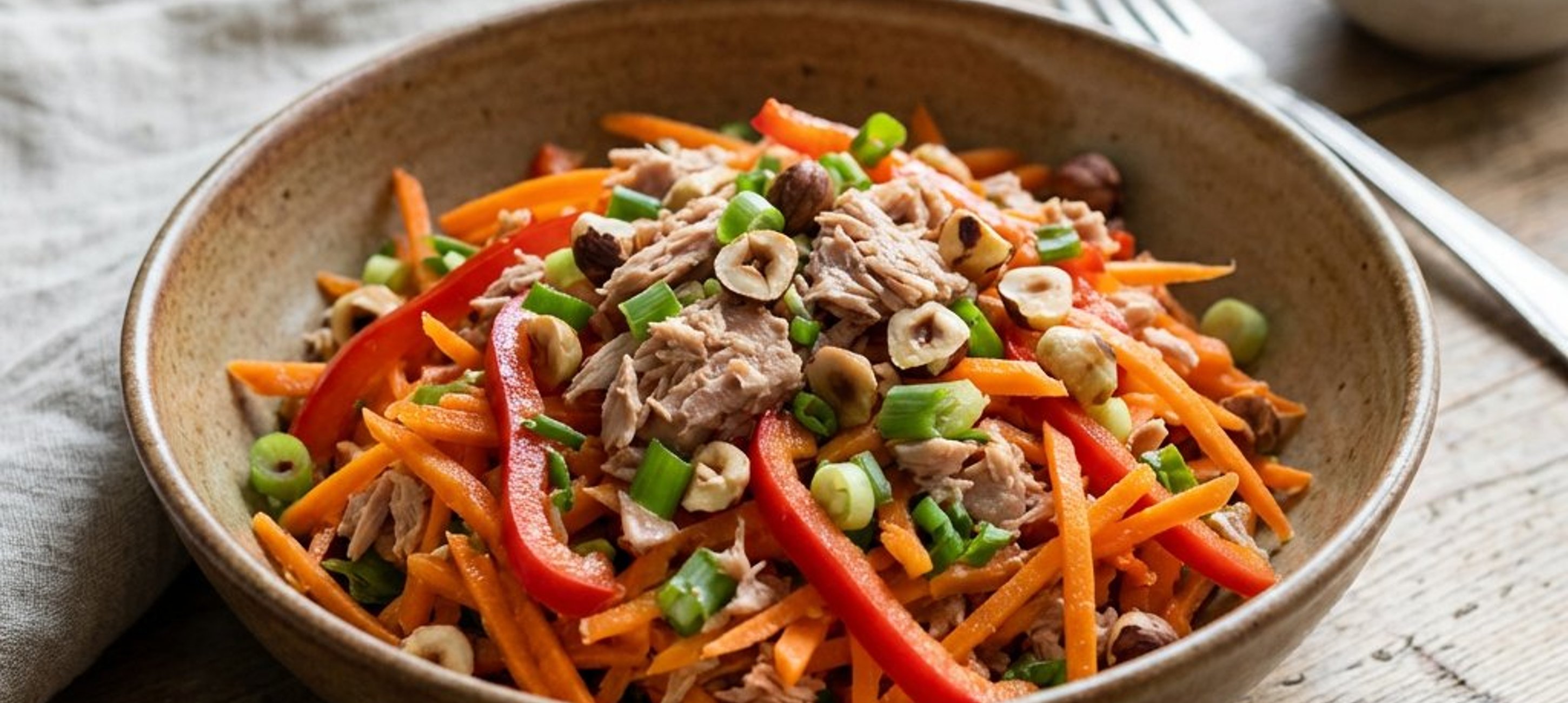 - 6Serviți salata decorată cu bucățelele de ton, restul de alune și stropită cu dressingul pregătit.