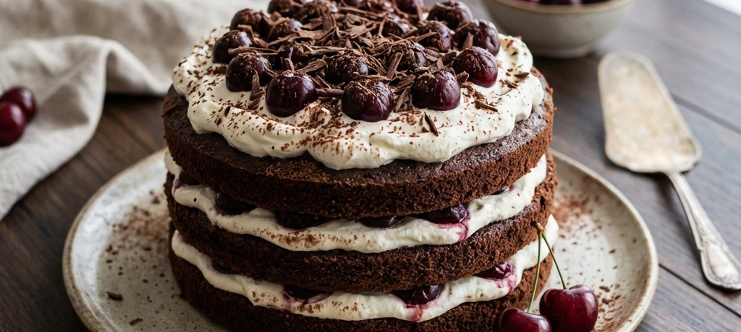 - 3La final, decorați tortul cu vișine proaspete și, opțional, cu așchii de ciocolată neagră.