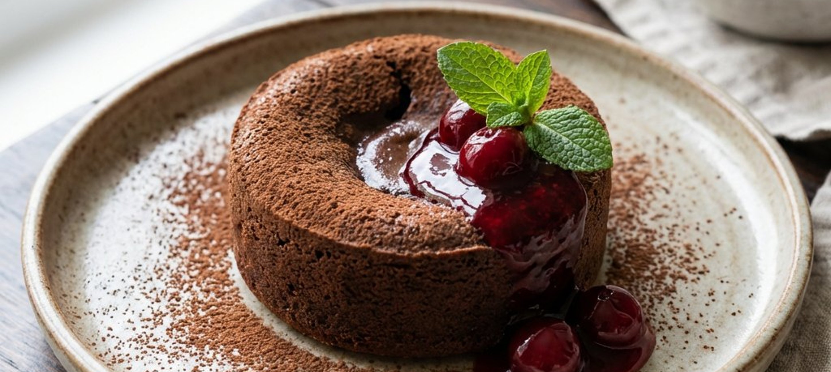 - 1Serviți fondantul imediat, alături de sosul de vișine. Pudrați ușor cu zahăr pudră și decorați cu frunze de mentă proaspătă.