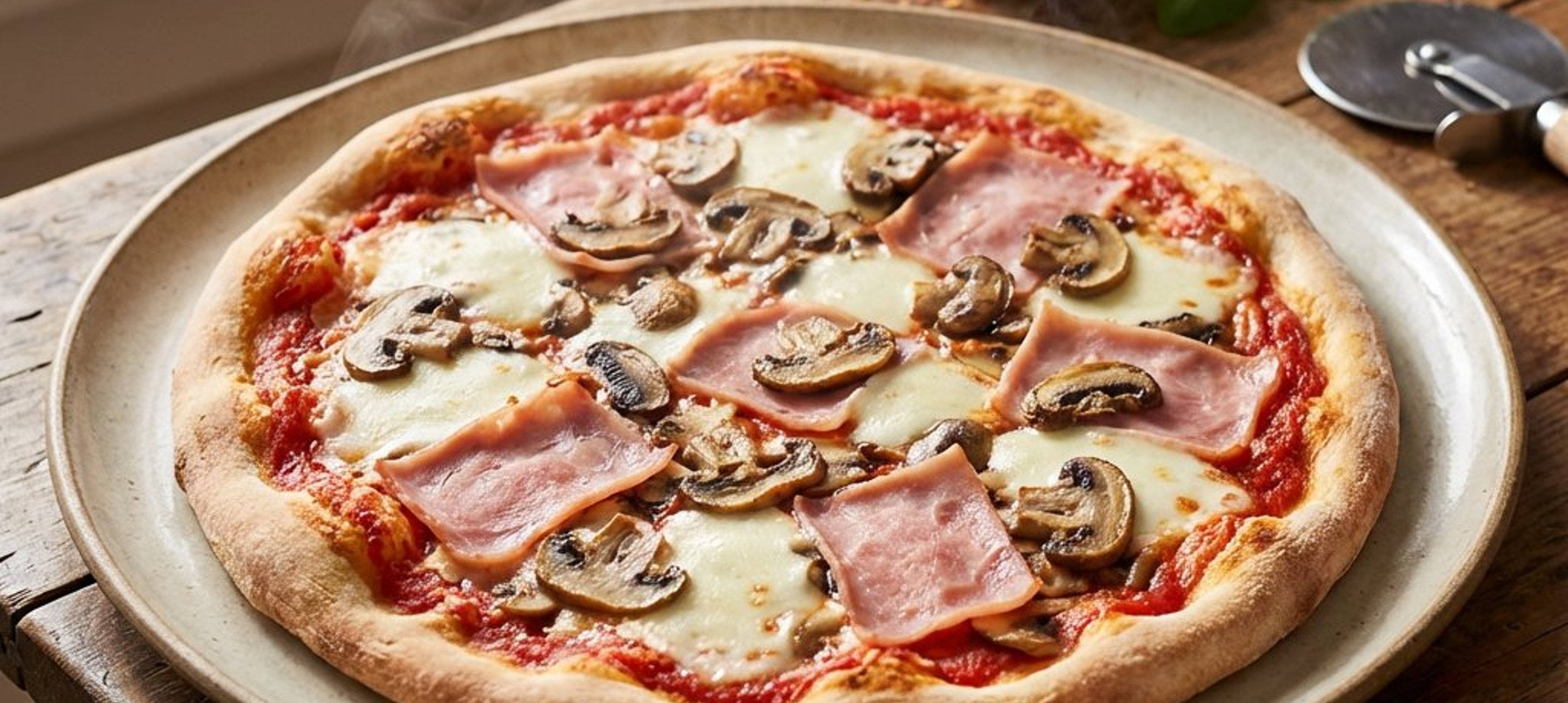 - 3Distribuiți uniform feliile de mozzarella, apoi așezați feliile de șuncă și ciupercile deasupra.