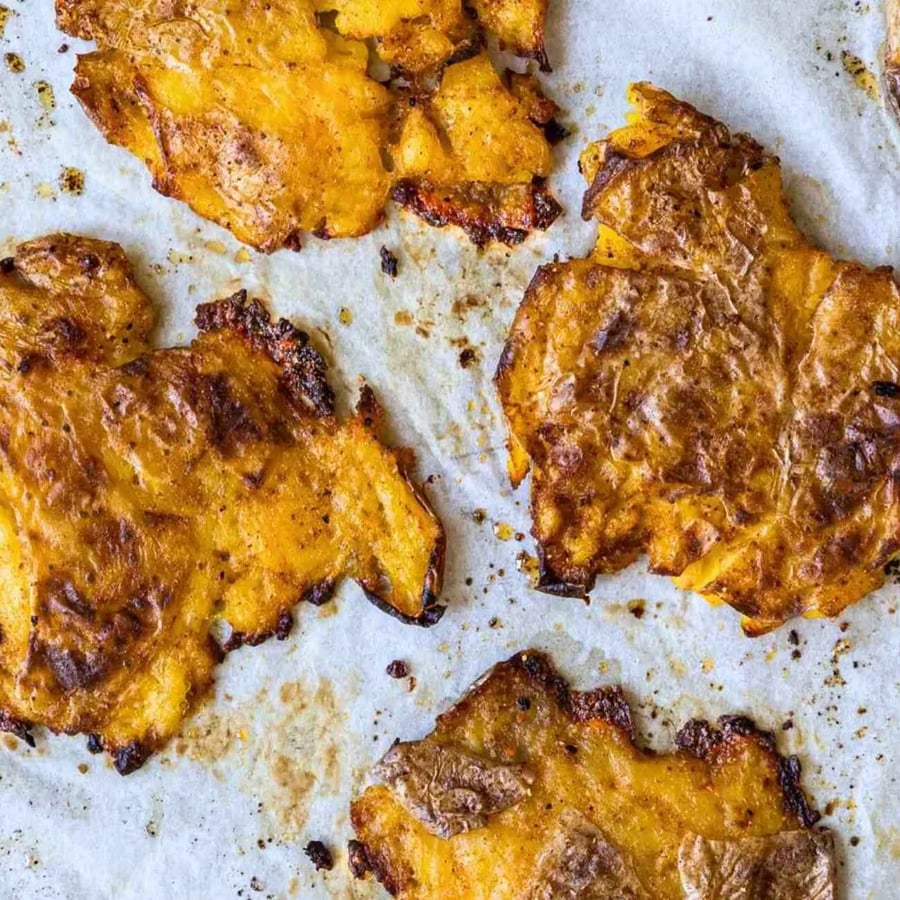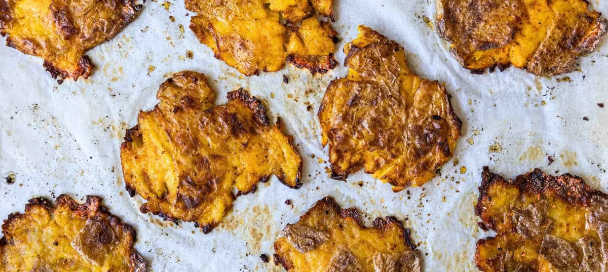 - 2Așază cartofii fierți în tavă și, cu fundul unui pahar sau al unei căni, zdrobește-i ușor. Cu cât îi aplatizezi mai mult, cu atât vor fi mai crocanți. Lasă-i așa, zdrobiți, încă 5 minute, pentru a lăsa aburul să iasă. Într-un bol mic, amestecă uleiul, sarea, piperul, usturoiul uscat și boiaua afumată, apoi unge fiecare cartof cu acest mix. Dă tava la cuptor pentru 25 de minute sau până când cartofii sunt aurii și crocanți.