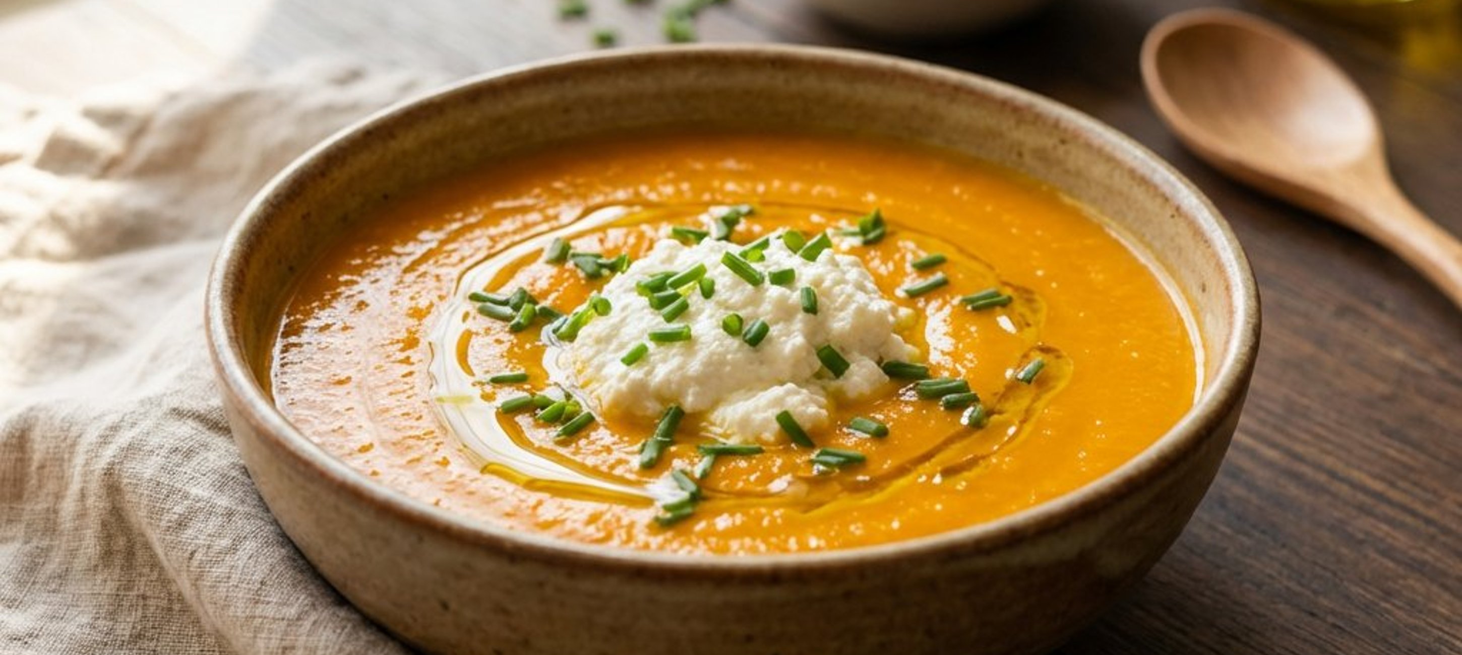 - 2Turnați supa în boluri. În fiecare porție adăugați o lingură de ricotta proaspătă, decorați cu arpagic verde tocat și puțin piper proaspăt măcinat, apoi finalizați cu restul de ulei de măsline extra virgin.