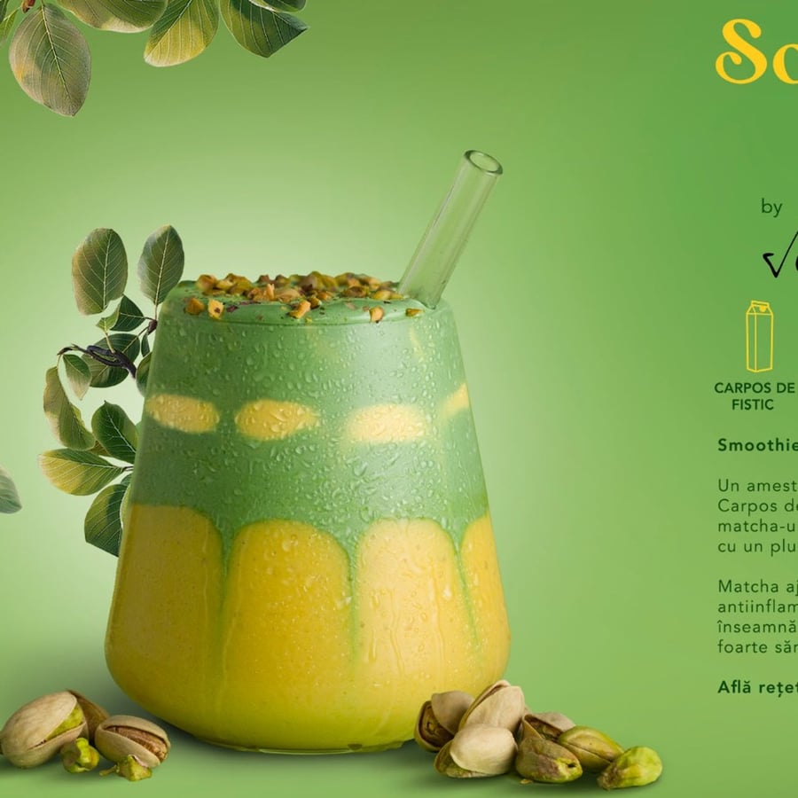 - 11️⃣ Primul strat Blenduiește mango-ul, băutura vegetală Carpos de Fistic și turmericul până obții un smoothie dens. Toarnă în paharul transparent. 2️⃣ Al doilea strat Blenduiește banana, băutura vegetală Carpos de Fistic și matcha până obții un smoothie dens. Toarnă cu grijă peste primul strat. Presară fistic mărunțit.