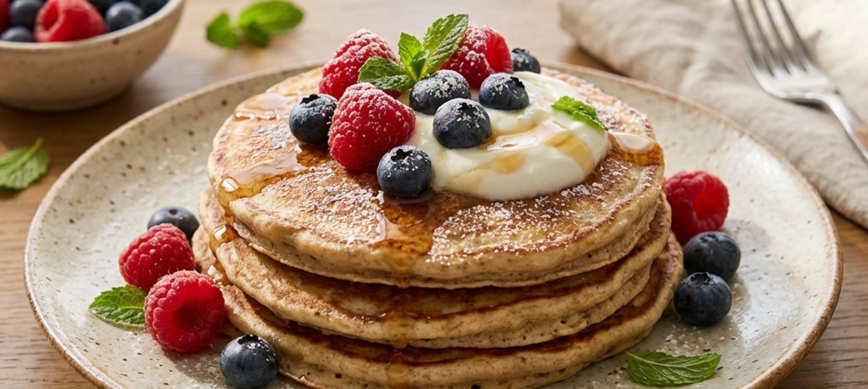 - 1Servește clătitele calde, alături de o porție generoasă de iaurt natur și fructe proaspete de pădure.
