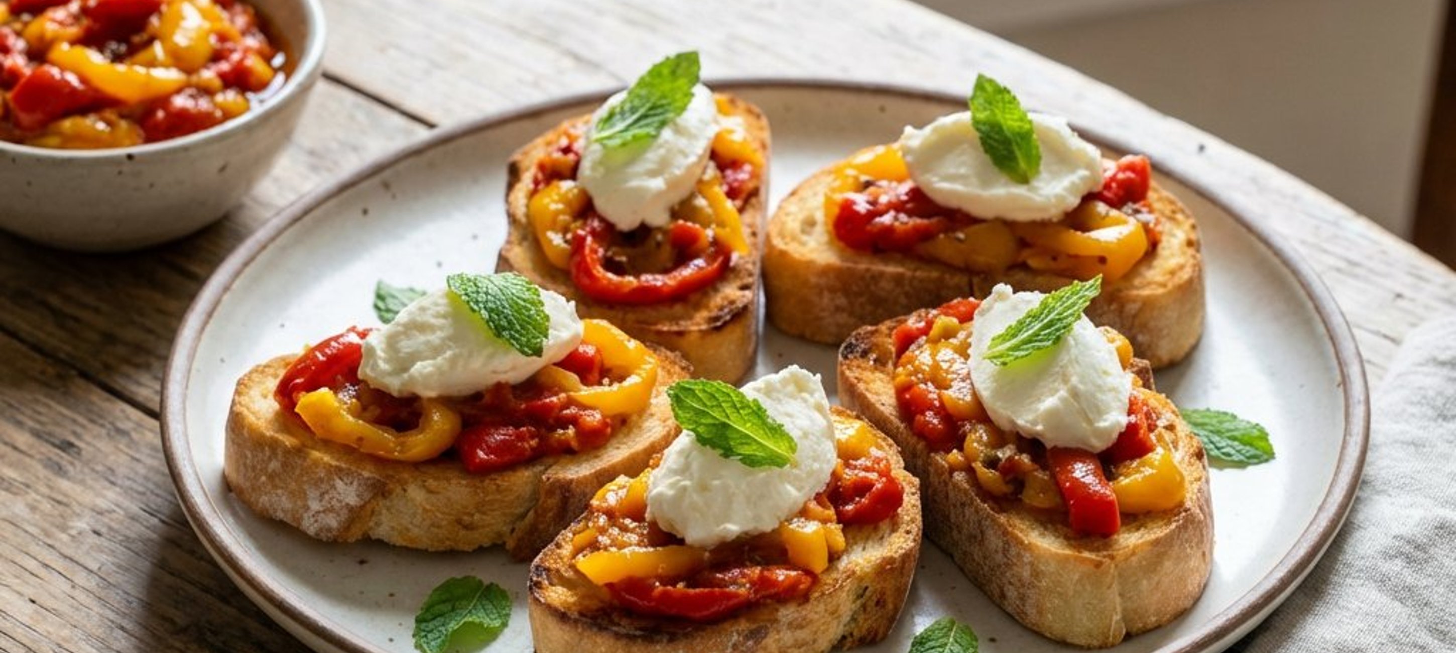 - 3Prăjiți feliile de ciabatta într-o tigaie uscată, la foc mediu, până devin aurii și crocante. Pe fiecare felie de ciabatta caldă, puneți o porție generoasă de tapenadă de ardei, adăugați o lingură de mascarpone deasupra și decorați cu restul de 12 frunze de mentă proaspătă. Finalizați cu puțin piper proaspăt măcinat.