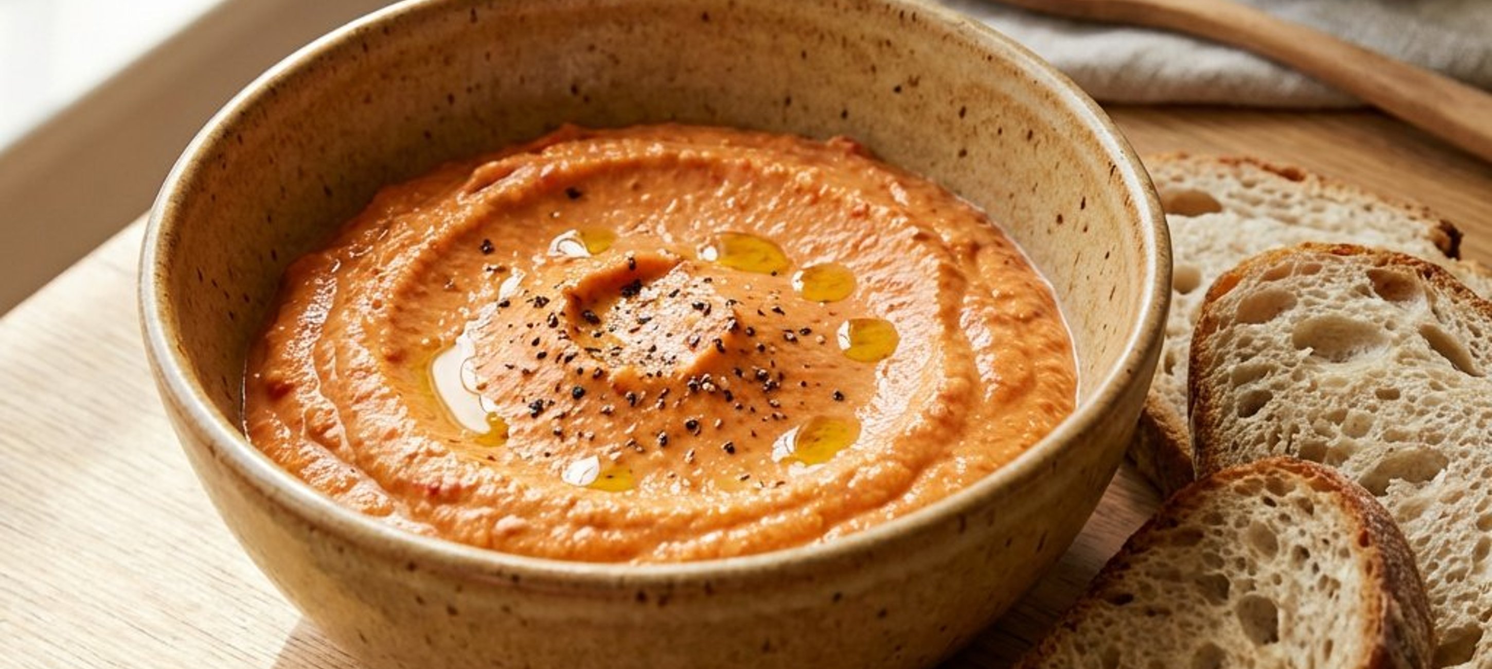 Serviți pasta pe felii de pâine prăjită sau cu bastonașe de legume proaspete.