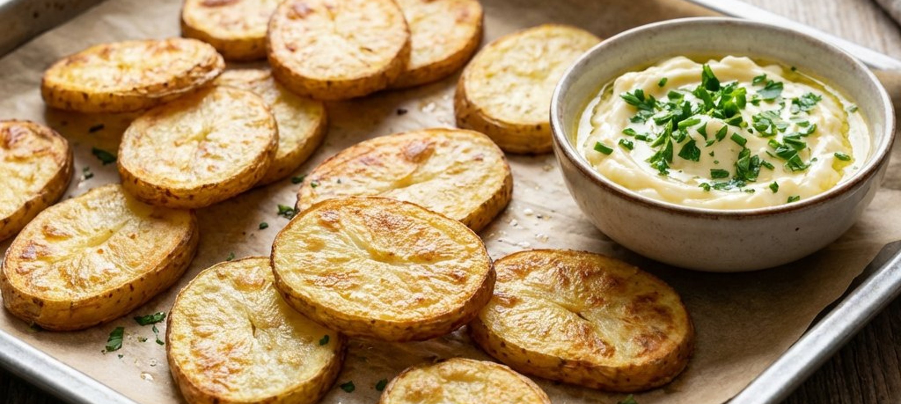 - 2Spălați bine cartofii și tăiați-i în felii rotunde cu o grosime de aproximativ 4 mm. Așezați feliile una lângă alta pe tavă și coaceți-le în cuptorul preîncălzit timp de aproximativ 18 minute, până când devin moi. La jumătatea timpului de coacere, întoarceți feliile de cartofi pe tavă pentru o rumenire uniformă.