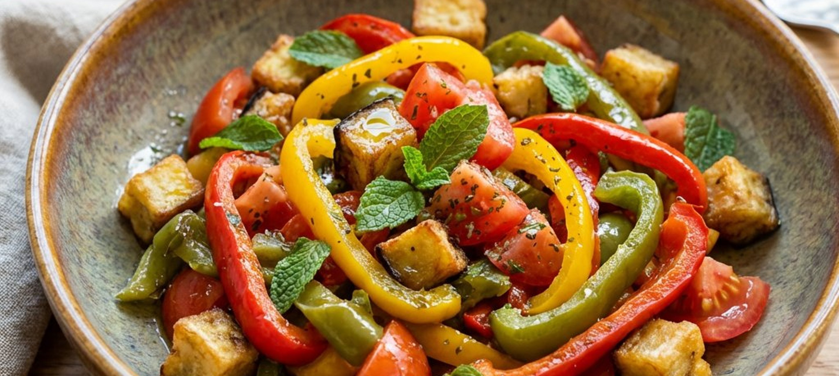 - 2Adăugați vinetele prăjite în sos și mai fierbeți totul timp de 5 minute. Luați de pe foc, condimentați cu sare și piper negru proaspăt măcinat. Turnați amestecul peste ardeii copți din bol și amestecați ușor. După ce salata s-a răcit, adăugați frunzele de mentă tăiate fin.