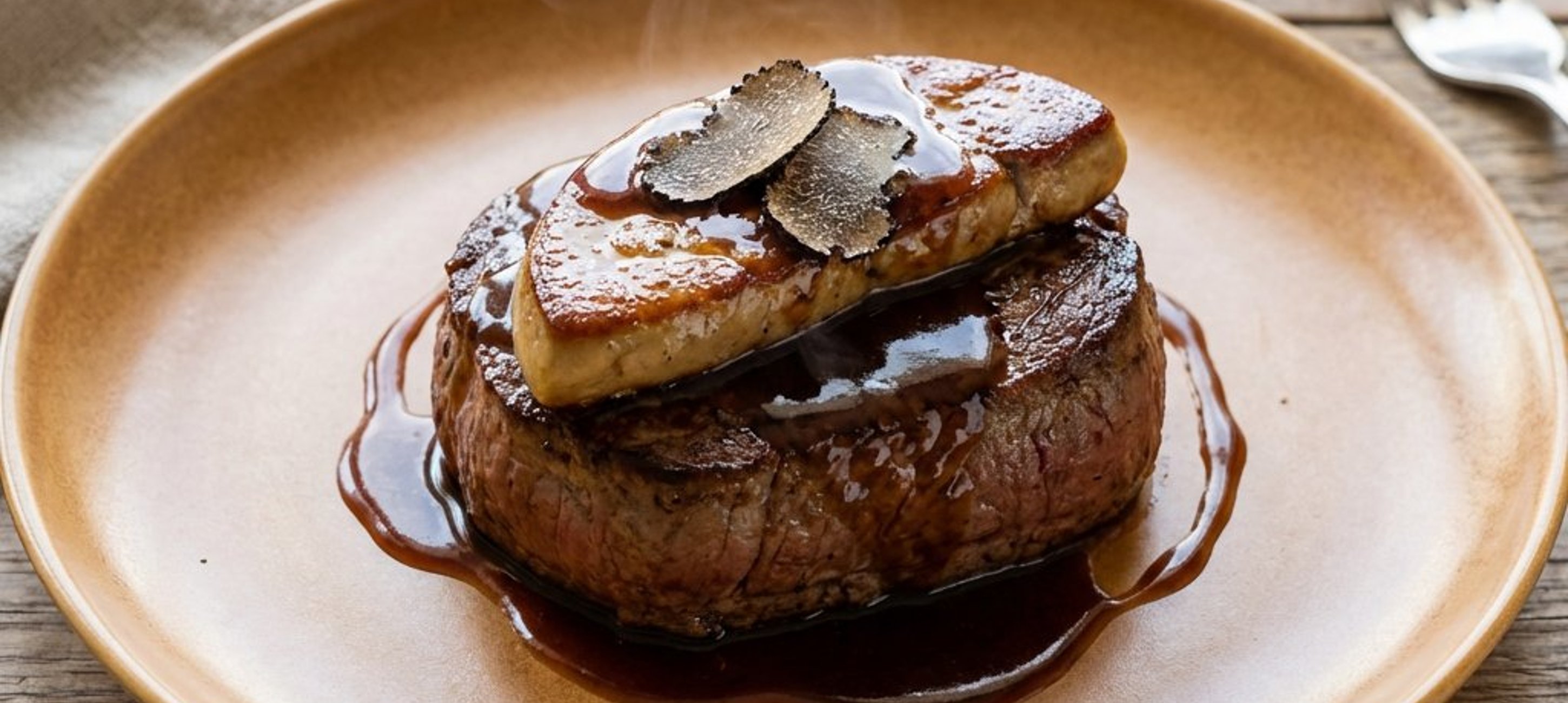 - 2Încălziți farfuriile în cuptor. Turnați puțin sos Madeira pe fiecare farfurie, așezați deasupra mușchiul de vită, apoi o felie de foie gras și decorați cu lamele de trufe negre. Serviți restul de sos separat.
