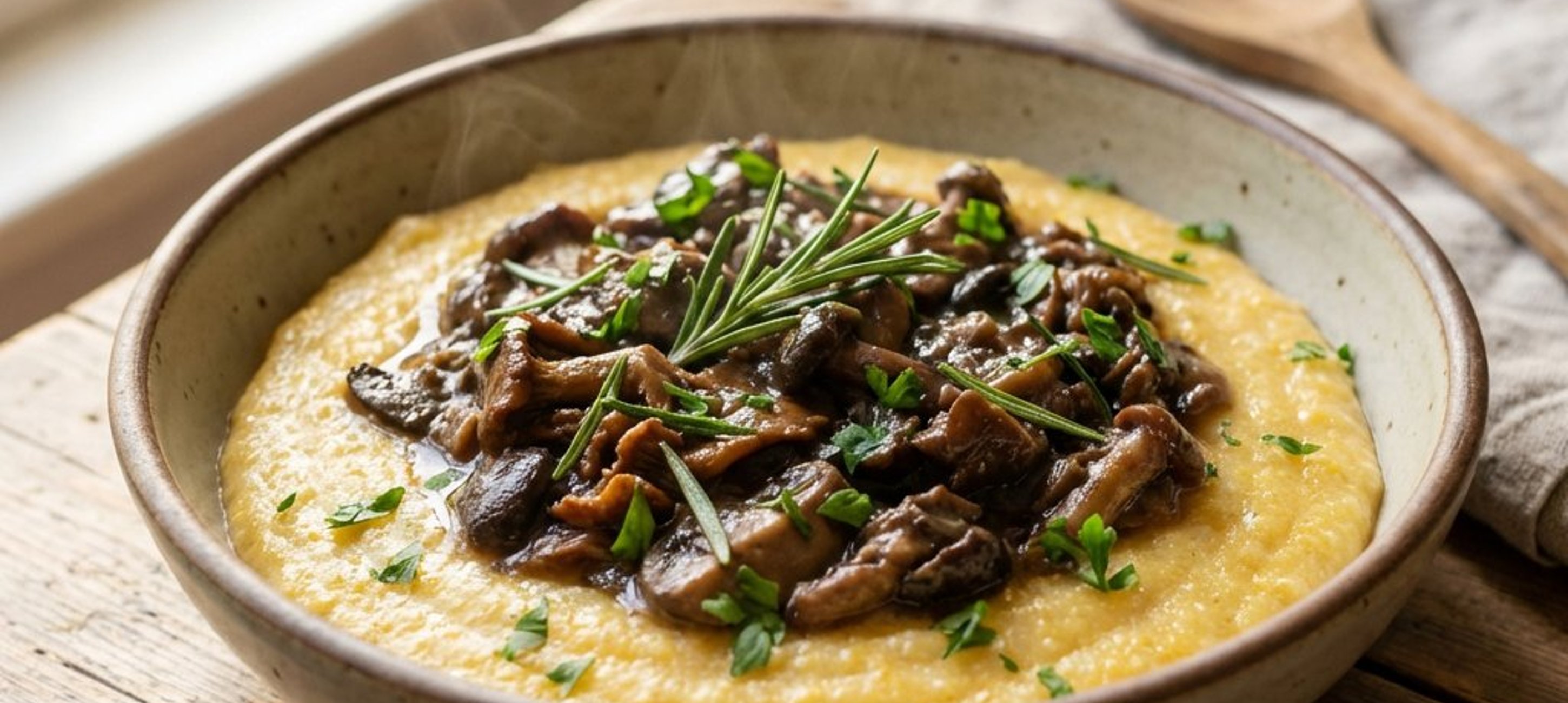 Pentru o textură extra fină, treceți mămăliga printr-o sită înainte de a adăuga untul. Puteți folosi orice amestec de ciuperci preferați, dar hribii oferă cea mai intensă aromă.