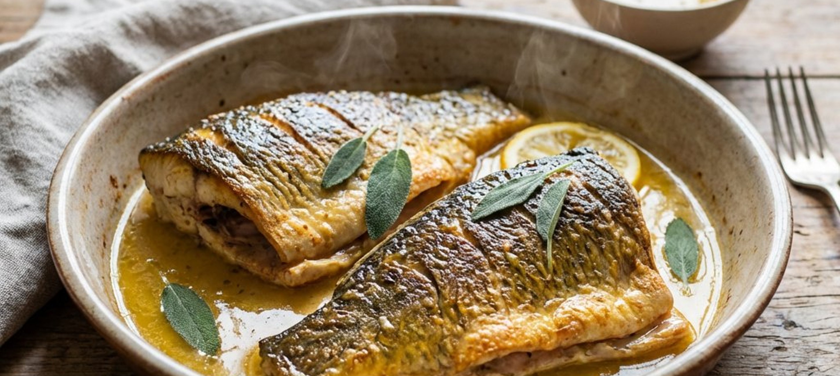 - 4În aceeași tigaie în care ați prăjit peștele, încingeți din nou grăsimea rămasă la foc mare. Adăugați frunzele de salvie și turnați vinul alb. Lăsați vinul să scadă până când în tigaie rămâne aproape doar grăsimea. Adăugați 150 ml de apă și lăsați să fiarbă timp de 1 minut, apoi luați tigaia de pe foc.