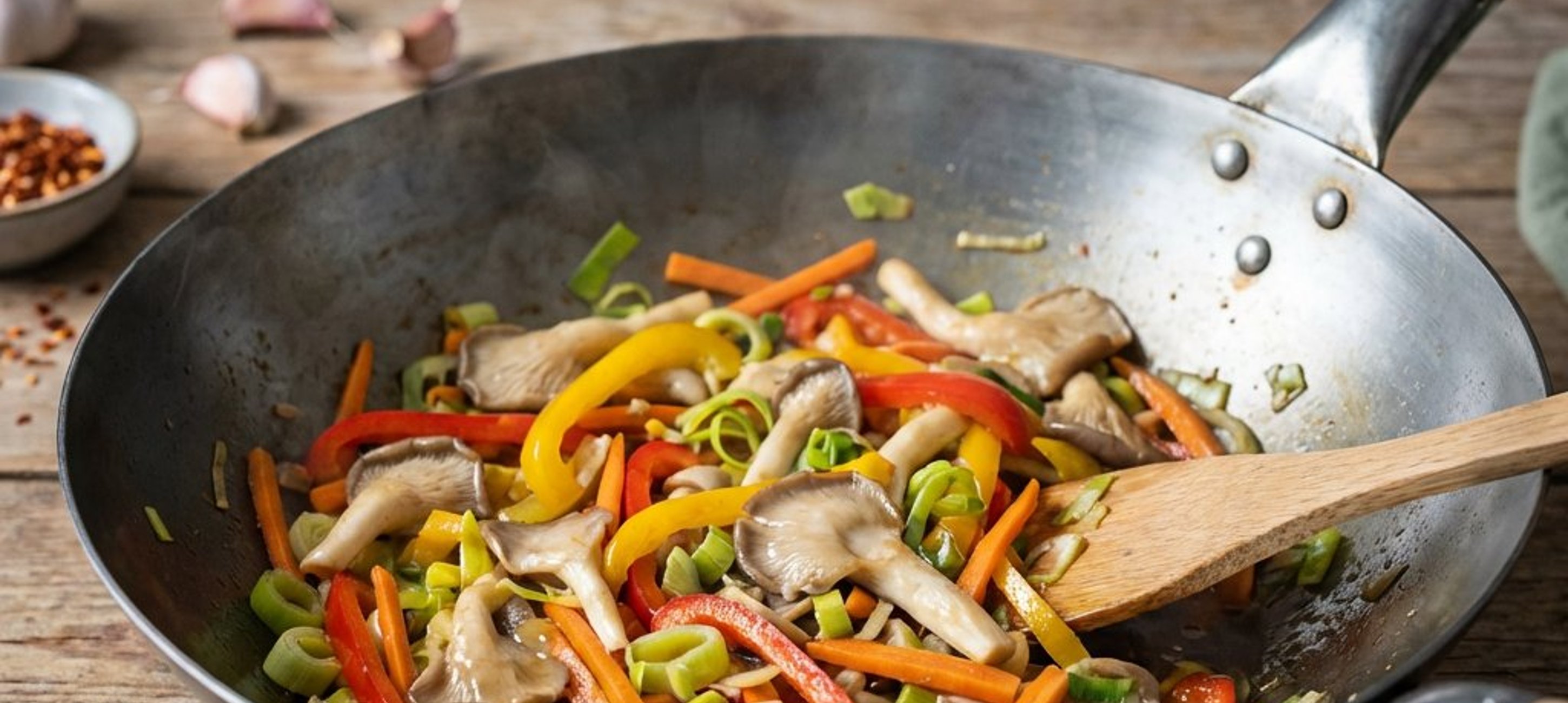 Păneul trebuie să fie cu adevărat foarte încins. Altfel, ingredientele se vor înăbuși și preparatul final își va pierde prospețimea și textura legumelor ușor croante.
