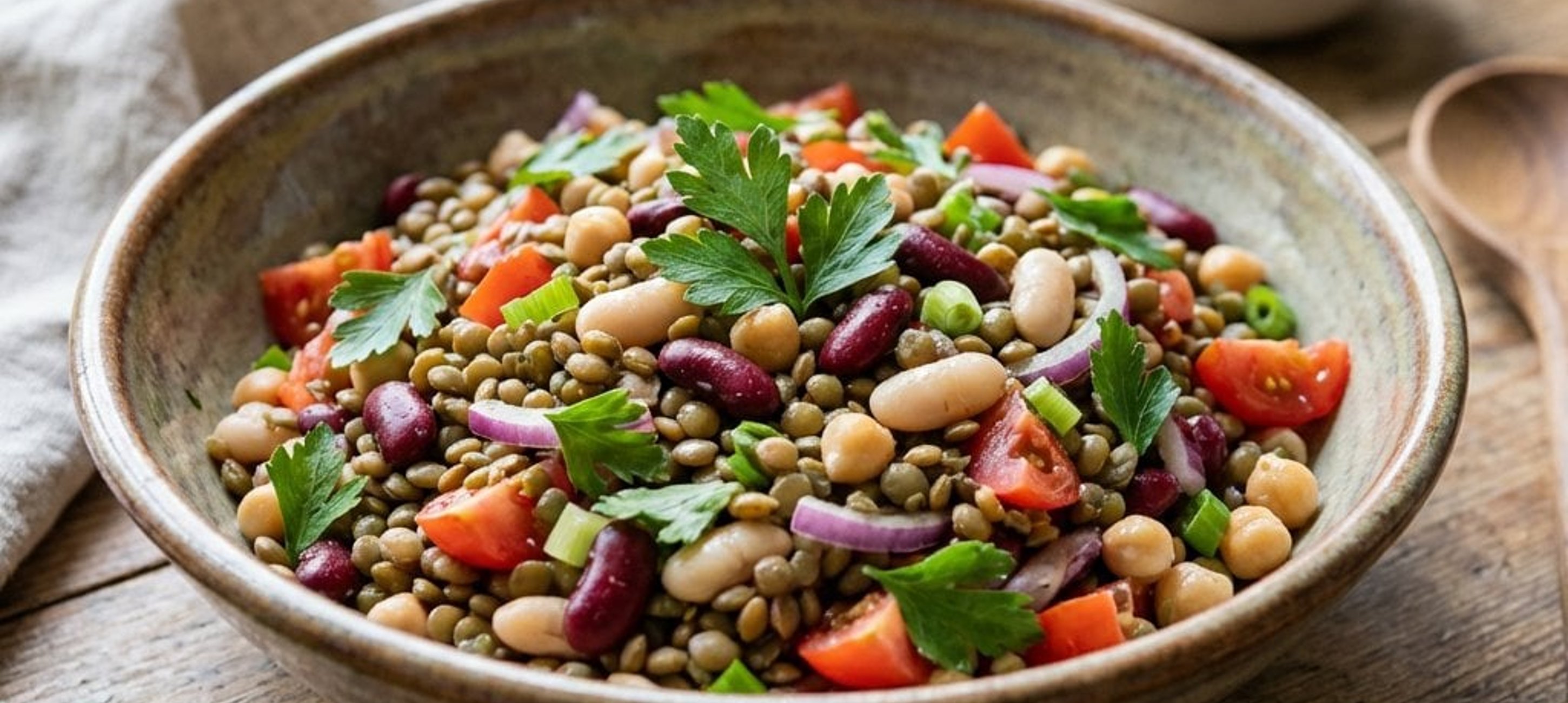 - 2Într-un bol mare, amestecați toate ingredientele (lintea, fasolea, năutul, legumele tăiate, sucul de lămâie, uleiul de măsline și condimentele). Amestecați bine pentru a omogeniza aromele.