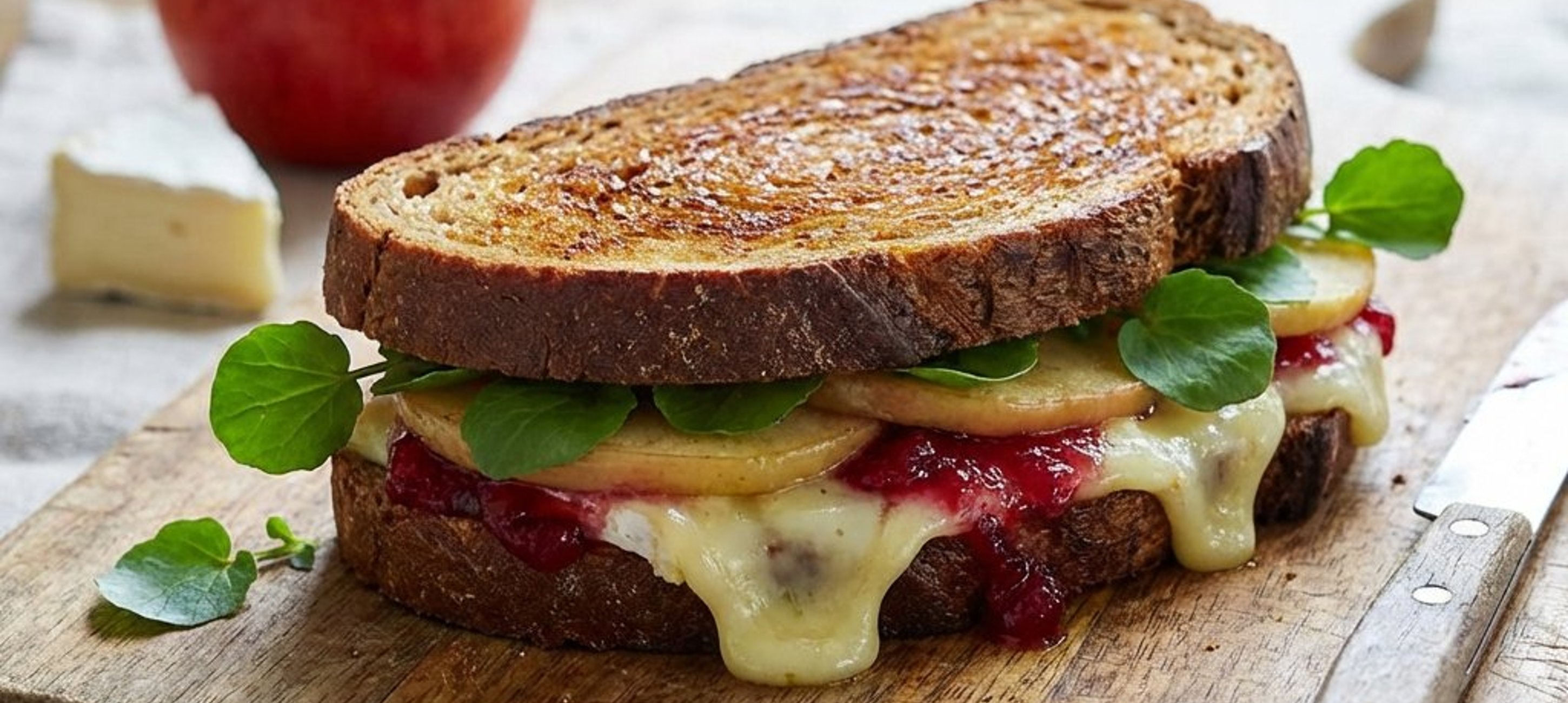- 1Încălziți o tigaie la foc mic și așezați o felie de pâine cu partea unsă cu unt în jos. Așezați deasupra câteva felii de brânză Brie, apoi felii de măr scurse de vin, presărați puțină rucola și întandeți un strat de dulceață de merișoare. Acoperiți cu o altă felie de pâine, de data aceasta cu partea unsă cu unt în sus.