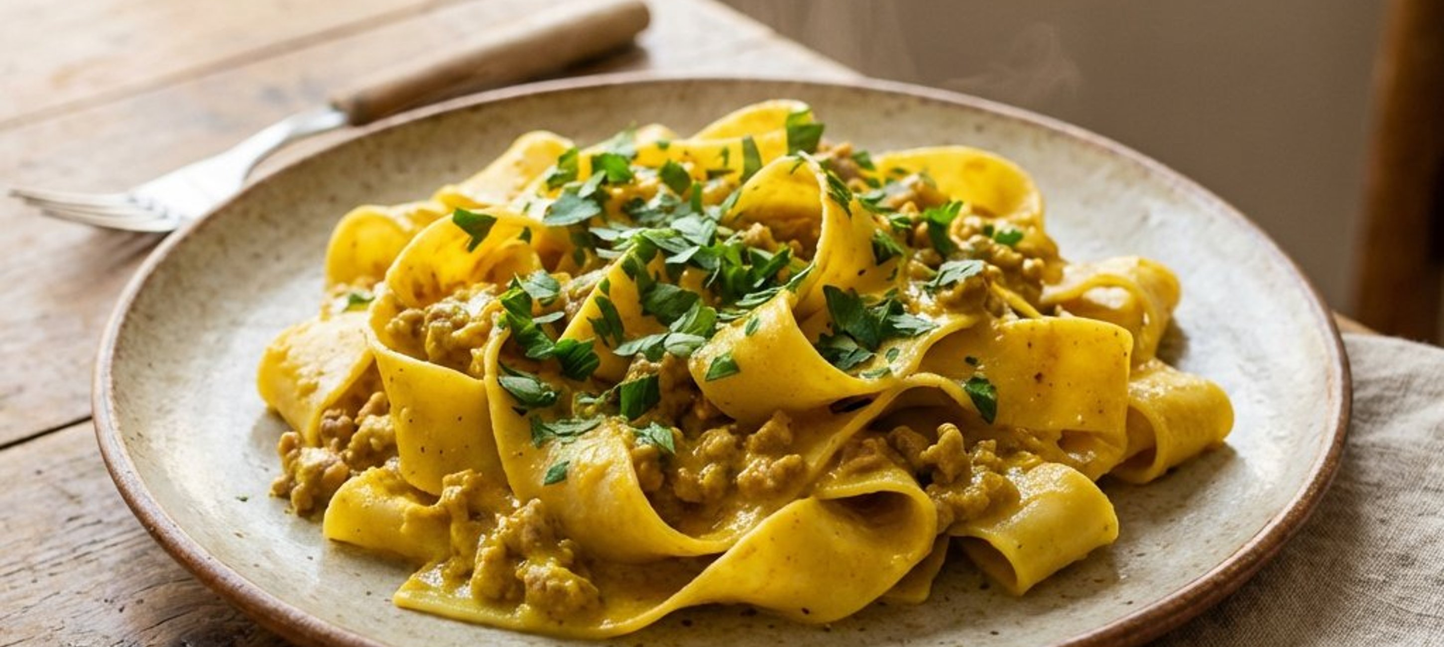 Încercați să folosiți pappardelle proaspete pentru o textură mult mai fină și un sos care aderă perfect la paste. Turmericul nu oferă doar o culoare vibrantă, ci și o notă pământie care completează carnea de porc.