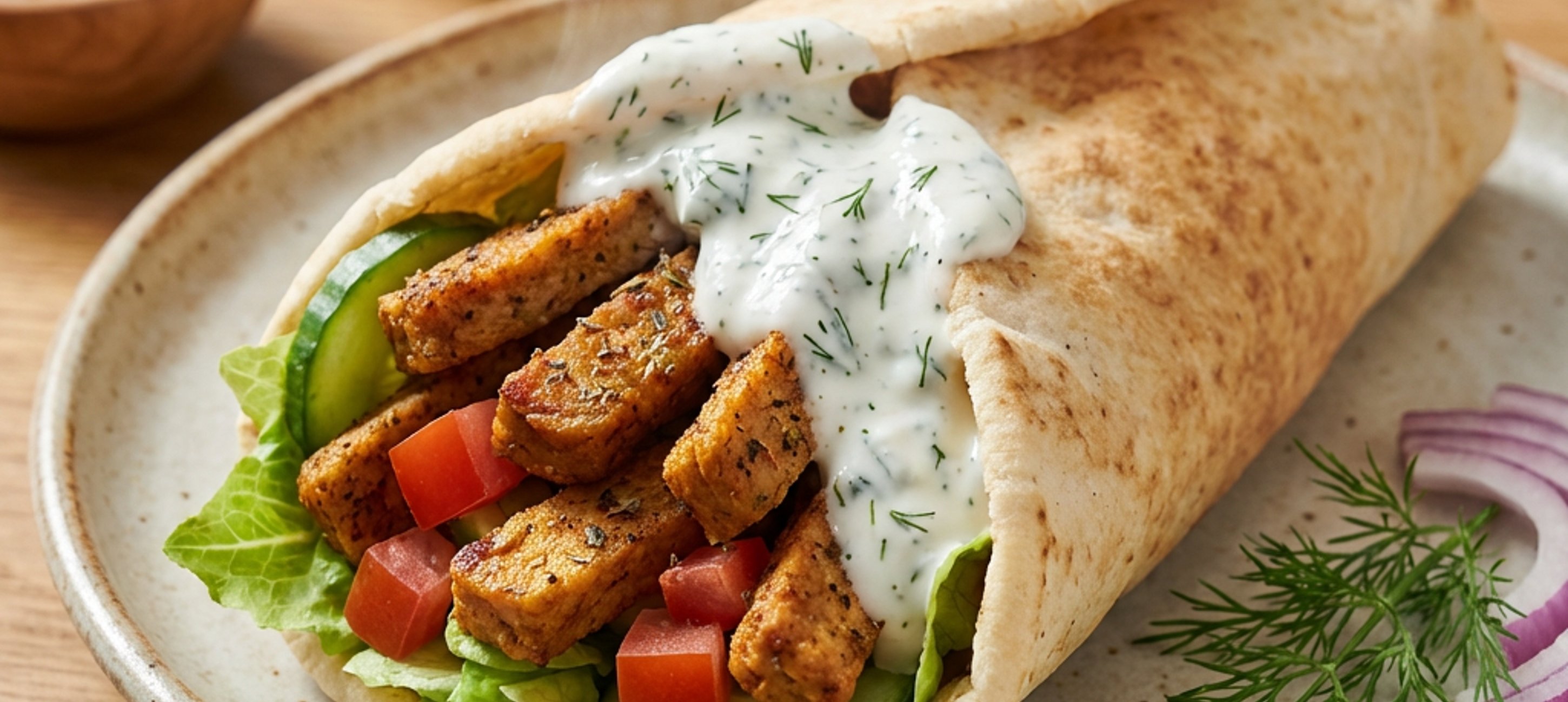 - 5Pentru asamblare: unge interiorul fiecărei pita calde cu sosul de iaurt, adaugă salată, roșie, castravete și fâșiile de gyros.