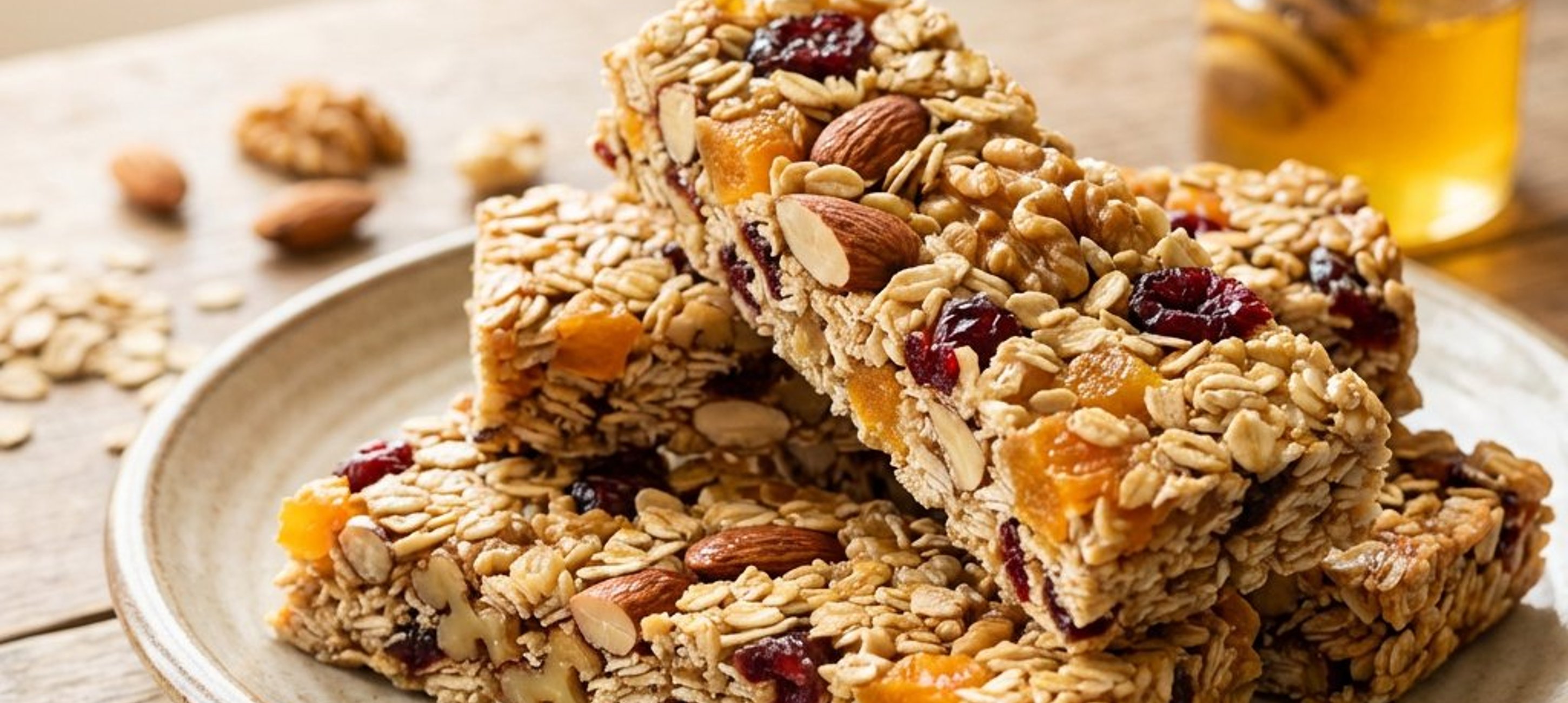 - 1Tapetați o tavă mică (aprox. 25 x 15 cm) cu hârtie de copt. Într-un bol încăpător, amestecați fulgii de ovăz prăjiți, nucile, făina și sarea. Adăugați fructele uscate tocate și mierea. Amestecați bine până când obțineți o compoziție lipicioasă. Cel mai ușor este să folosiți mâinile pentru a omogeniza totul.