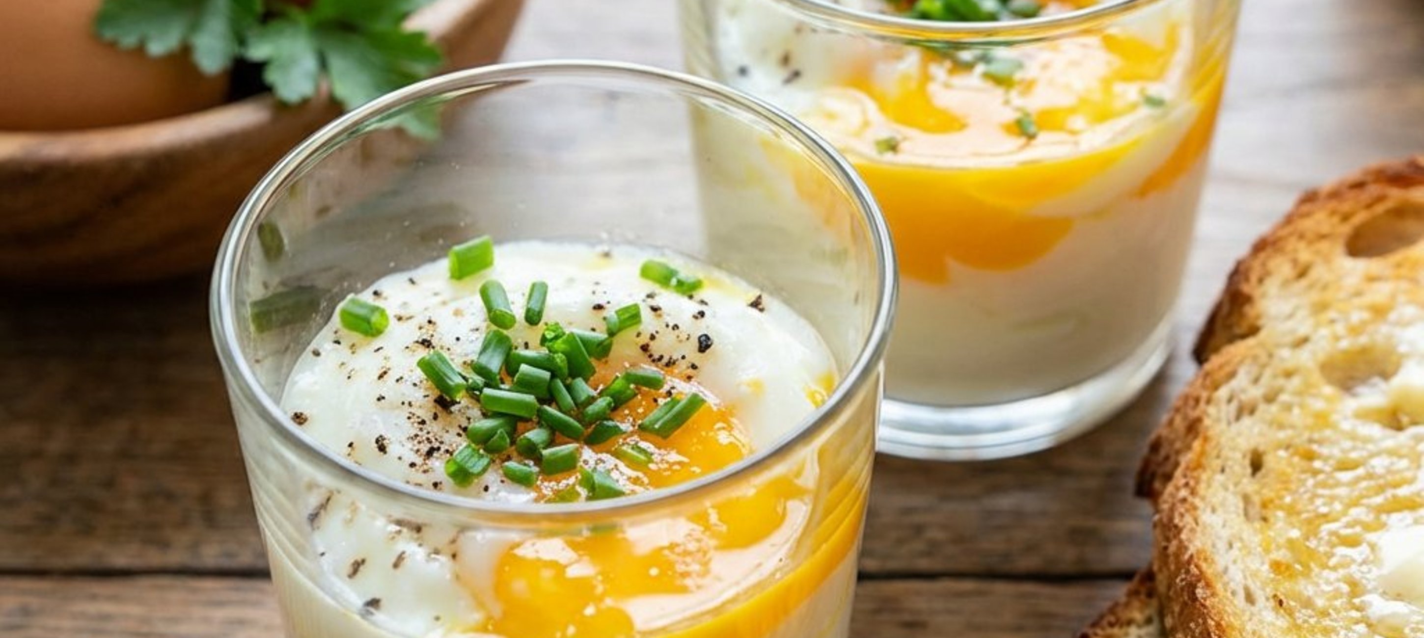 - 1În timp ce ouăle fierb, pregătiți patru pahare de servire, farfurioare și lingurițe lungi. Prăjiți feliile de pâine toast și ungeți-le cu unt. Tocați mărunt ierburile proaspete (arpagicul sau pătrunjelul).