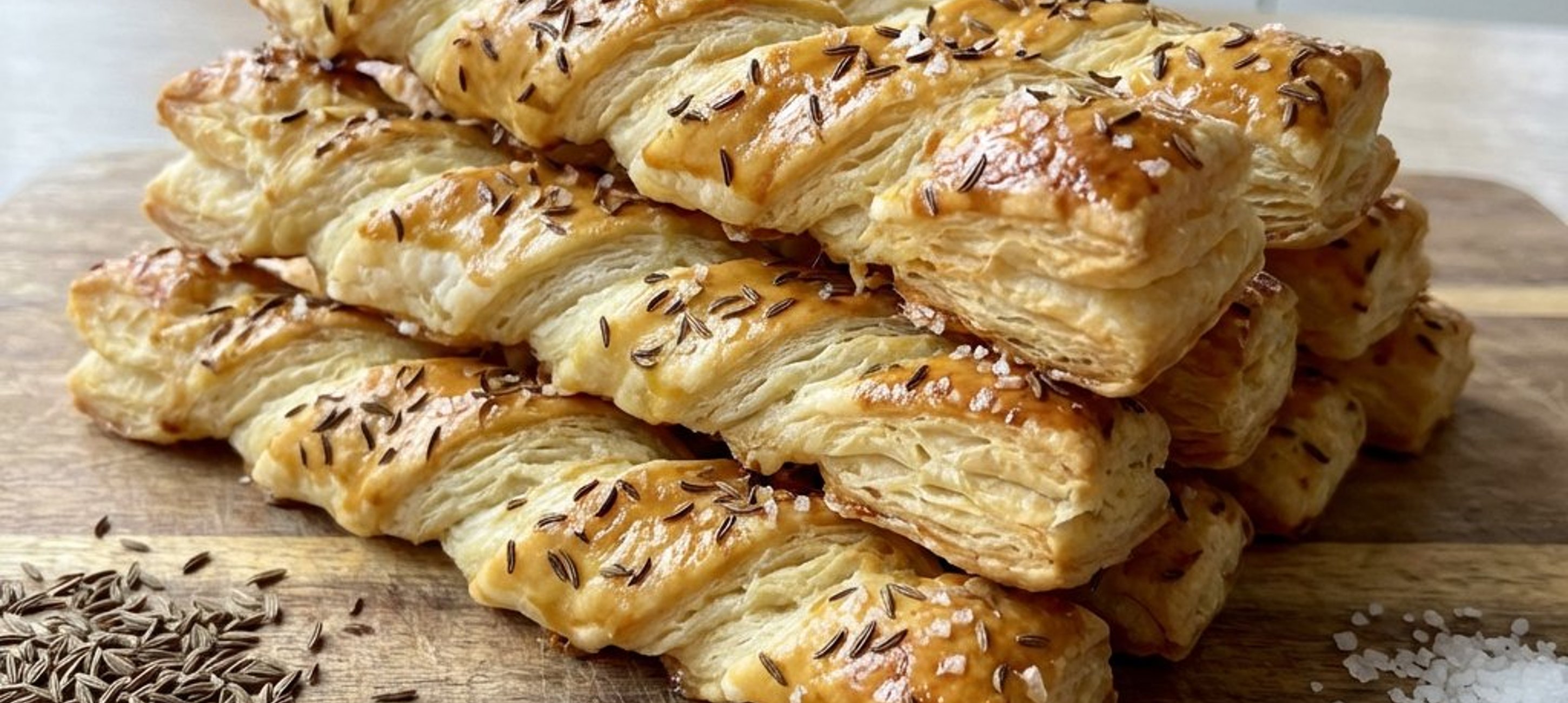 - 3Presărați una dintre foi cu sare grunjoasă și semințe de chimen. Acoperiți cu a doua foaie, cu partea unsă cu gălbenuș în jos, și apăsați ușor pentru a se lipi. Tăiați aluatul astfel obținut în fâșii late de 1 cm. Răsuciți fiecare fâșie sub formă de spirală și așezați-le în tava pregătită. Coaceți în cuptorul preîncălzit timp de 15–20 de minute, până când devin aurii și crocante.
