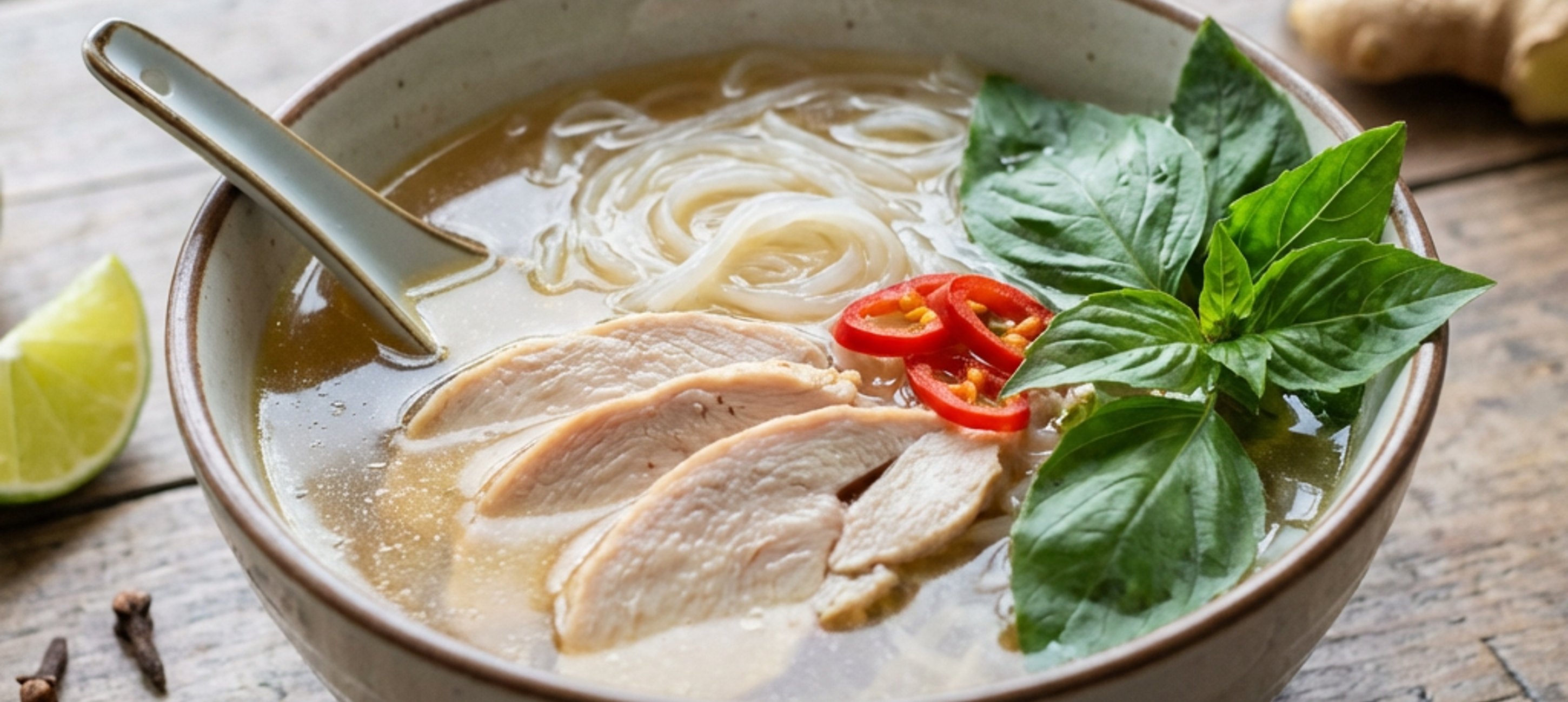 - 1Taie ghimbirul felii subțiri. Fierbe supa la foc mic împreună cu ghimbirul, anasonul stelat, cuișorul și scorțișoara timp de 30 de minute. Strecoară condimentele.