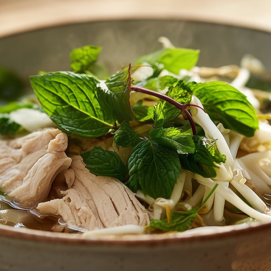 - 6Adaugă tăițeii și completează cu muguri de fasole, busuioc, mentă și coriandru.